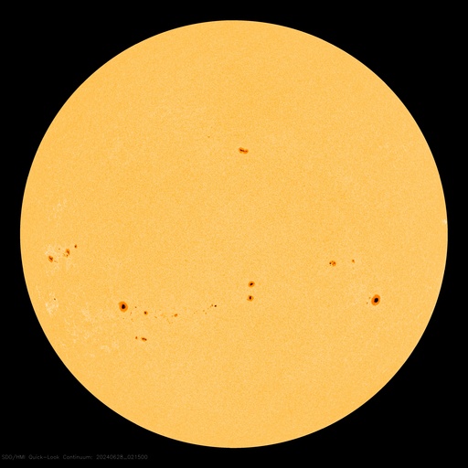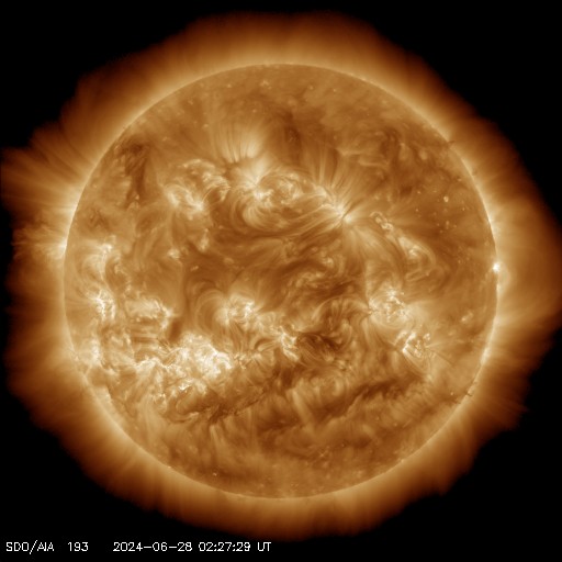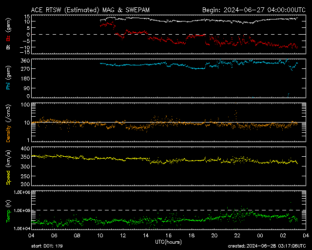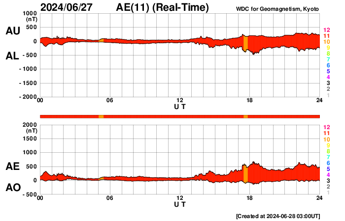 2024/ 6/28 12:18 更新 太陽風磁場が南向きに強まり、磁気圏の活動も強まっています。 担当 篠原 太陽風の速度は、350km/秒から320km/秒へ少し下がり、 より低速になっています。 一方、磁場強度は、 昨日の午後から10nTを超えるくらいに強まっていて、 現在も12nTと強まった状態です。 磁場の南北成分は、 今日に入った頃から南向きで推移する様になり、 グラフの最後は、-10nTに達するくらいの強まりになっています。 このため、磁気圏の活動もある程度強まっていて、 AE指数は、グラフの中盤から500nTの中規模の変化が続く様になり、 後半は1000nTと大きい変化も発生しています。 太陽風磁場が南寄りになっている間は、 磁気圏の変化に注目してください。 太陽は、南東側(左下)の黒点群で、 Cクラスの小規模フレアが度々発生しています。 最大の変化は、今朝、28日8時半(世界時27日23時半)に、 3730群で発生したC6.6です。 グラフの最後のC3.9の小規模フレアは、 東端(左端)の少し向こう側で発生しています。 この後、活動的な領域が現れるかもしれません。 ![]() SDO衛星のAIA193カメラによる太陽コロナの様子 (c) SDO (NASA) ![]() SDO衛星による太陽の可視光写真。マウスの矢印を写真に重ねると、黒点番号付きの写真に切り替わります。 (c) SDO (NASA) ![]() ACEが観測した太陽風の磁場(1番上の枠、白線は全体の強度、赤線は南北成分) および、太陽風の密度(3番目の橙線)、速度(4番目の黄線) (c) NOAA/SWPC ![]() AE指数(速報値) 下段のAEグラフの値が高くなると、オーロラ活動が活発化しています。 (c) 京都大学WDC ![]() ![]() 27日の太陽周期に合わせた図 太陽が同じ面を地球に向けていた27日前の変化から、今後を予想することができます。 (c) 作図:宇宙天気ニュース