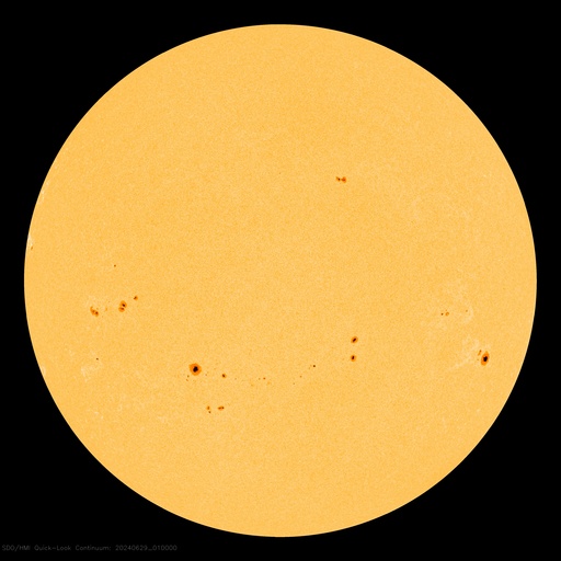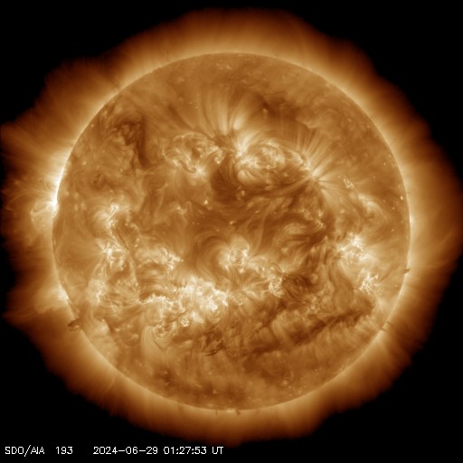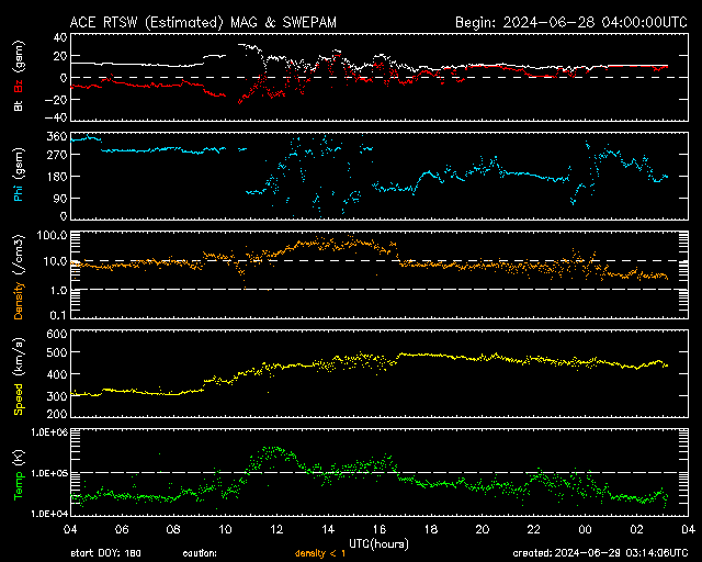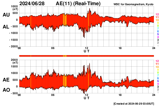 2024/ 6/29 12:15 更新 太陽風の乱れが到来して、磁場が強まりました。 担当 篠原 昨夕、28日18時(世界時28日9時)頃から、 太陽風の乱れがACE衛星で観測されています。 速度は、300km/秒と低速の状態から 440km/秒と平均的な状態に高まった程度ですが、 磁場強度は、10nTから初めに20nTへ、 続いて、30nTへ達する強まりが到来しています。 26日のニュースでお知らせした、 25日のCME(コロナ質量放出)による乱れが 到来した可能性があります。 太陽風磁場の南北成分は、 昨日のニュース以降も-8nT程度の南向きが続き、 AE指数は800nT前後の中規模の変化が続いていました。 ここに磁場の強まりが到来して南向きが更に強まり、 -20nTに達する変化も観測されています。 このため、AE指数は1700nTに達する大きい変化も発生しました。 しかし、磁場の南北成分は次第に北寄りに傾向が変わり、 磁場強度は11nTと強まった状態が続いていますが、 磁気圏への影響は小さくなって、 AE指数の変化も小規模になっています。 太陽は、可視光写真を見ると、 南半球だけで黒点が10群に達しています。 しかし、活動としては低調で、 C2の小規模フレアが3回発生した程度です。 一方、北東の端(左上)に黒点が新しく現れていて、 ここでもC1〜3の小規模フレアが発生しています。 この後、活動の規模がどうなるか注目して下さい。