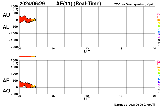 (c) SDO (NASA) ![]() SDO衛星による太陽の可視光写真。マウスの矢印を写真に重ねると、黒点番号付きの写真に切り替わります。 (c) SDO (NASA) ![]() ACEが観測した太陽風の磁場(1番上の枠、白線は全体の強度、赤線は南北成分) および、太陽風の密度(3番目の橙線)、速度(4番目の黄線) (c) NOAA/SWPC ![]() AE指数(速報値) 下段のAEグラフの値が高くなると、オーロラ活動が活発化しています。 (c) 京都大学WDC ![]() ![]() 27日の太陽周期に合わせた図 太陽が同じ面を地球に向けていた27日前の変化から、今後を予想することができます。 (c) 作図:宇宙天気ニュース