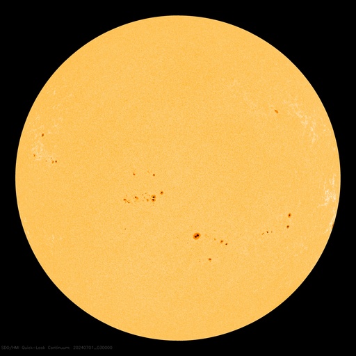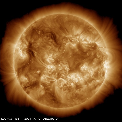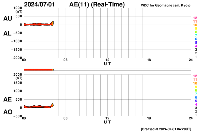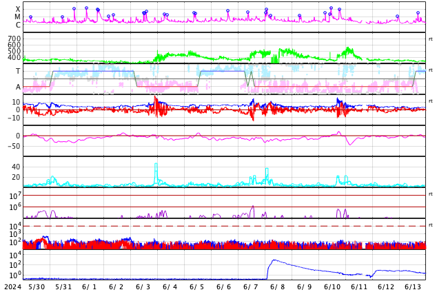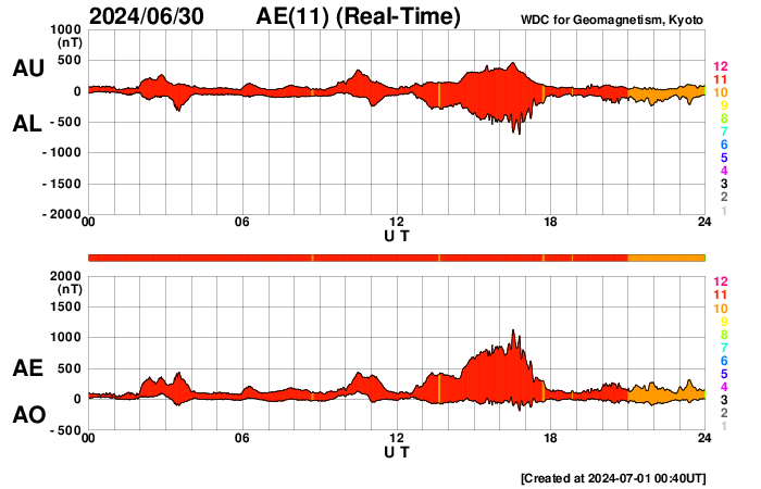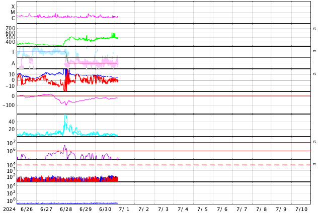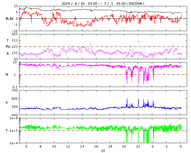 2024/ 7/ 1 13:23 更新 太陽風はやや高速です。太陽は穏やかです。 担当 篠原 太陽風は、今日はDSCOVR衛星のデータを表示しています。 NOAA/SWPCの太陽風のグラフで 久しぶりにDSCOVRの表示を見ました。 速度は、480km/秒とやや高速になっています。 磁場強度は、8nTから5nTにゆっくり下がって、 平均的な状態に戻っています。 磁場の南北成分は、グラフの前半は南寄りで、 後半は0nT付近になっていいます。 このため、AE指数は、 グラフの途中に1000nTに達する大きい変化が発生していますが、 その後は穏やかになっています。 SDO衛星AIA193では、コロナホールは特に見えていません。 太陽風は穏やかになりそうです。 太陽は、C1からC3の小さい小規模フレアが発生する程度で、 比較的穏やかな状態です。 しかし、可視光写真では、黒点群が15群も見えていて、 だいぶにぎやかです。