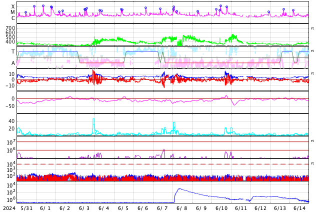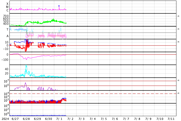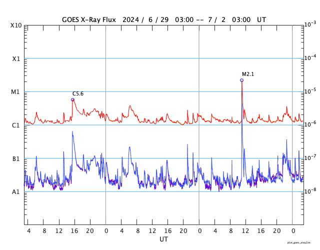 GOES衛星の太陽X線強度。赤・橙 = 0.1〜0.8 nm、青・紫 = 0.05〜0.4 nm (c) データ:NOAA/SWPC、作図:宇宙天気ニュース ![]() | ||||||||||||||||||||||||||||||||||||||||||||||||||||||||||||||||||||||||||||||||||||||||||||||||||||||||||||||||||||||||||||||||||||||||||||||||||||||||||||||||||||||||||||||||||||||||||||||||||||||||||||||||||||||||||||||||||||||||||||||||||||||||||||||||||||||||||||||||