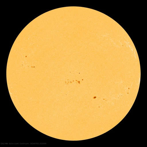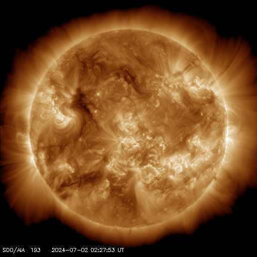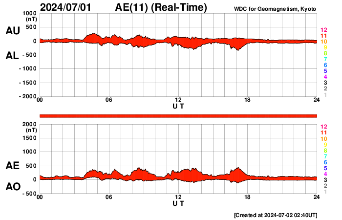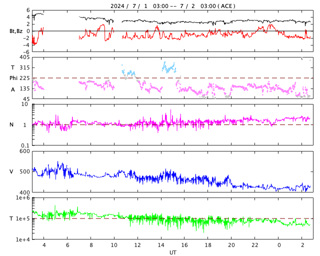 2024/ 7/ 2 12:00 更新 太陽風は平均的な速度になりました。太陽は概ね静穏です。 担当 篠原 太陽風のグラフは、ACE衛星に戻っています。 速度は500km/秒から420km/秒へ下がり、 平均的な状態です。 磁場強度は5nTから3nTへ下がり、 やや弱くなっています。 磁場の南北成分は、グラフの前半は弱い南寄りで、 速度がやや高速だったことと重なり、 AE指数は400nTの小規模の変化が続いています。 その後、磁場は0nT付近になり、 磁気圏は穏やかになりましたが、 グラフの最後で磁場は再び弱い南寄りになっています。 現在は太陽風の速度が一段下がっているので、 磁気圏の変化は小さい規模になりそうです。 太陽は、南西(右下)の3730黒点群で、 昨夜、1日20時(世界時1日11時)に M2.1の中規模フレアが発生しましたが、 目立つ変化はこのくらいで、 全体としては穏やかに推移しています。 ![]() SDO衛星のAIA193カメラによる太陽コロナの様子 (c) SDO (NASA) ![]() SDO衛星による太陽の可視光写真。マウスの矢印を写真に重ねると、黒点番号付きの写真に切り替わります。 (c) SDO (NASA) ![]() ACEが観測した太陽風の磁場(黒線は全体の強度、赤線は南北成分) 磁場の向き、プラズマの密度、速度、温度 (c) データ:NOAA/SWPC、作図:宇宙天気ニュース ![]() AE指数(速報値) 下段のAEグラフの値が高くなると、オーロラ活動が活発化しています。 (c) 京都大学WDC ![]() ![]() 27日の太陽周期に合わせた図 太陽が同じ面を地球に向けていた27日前の変化から、今後を予想することができます。 (c) 作図:宇宙天気ニュース