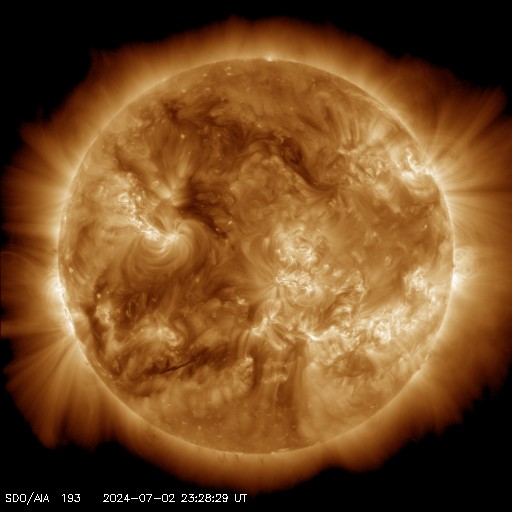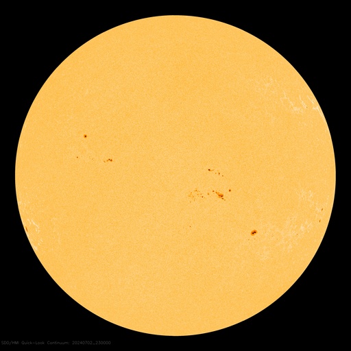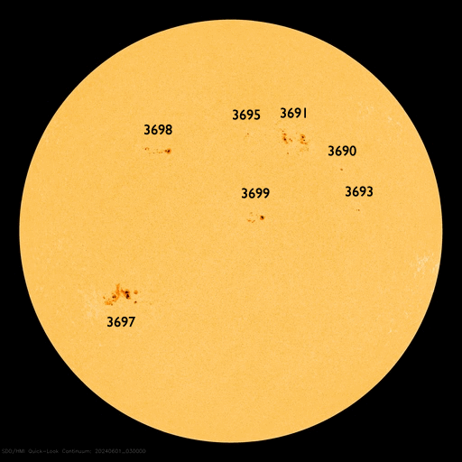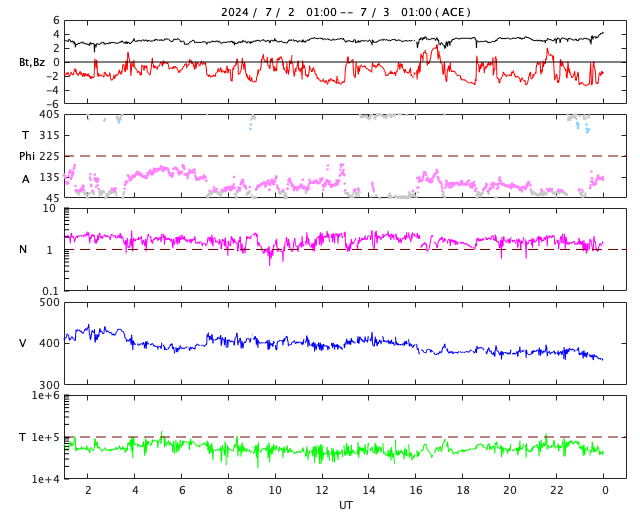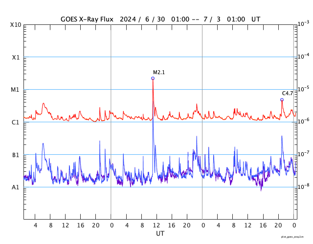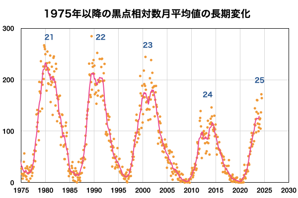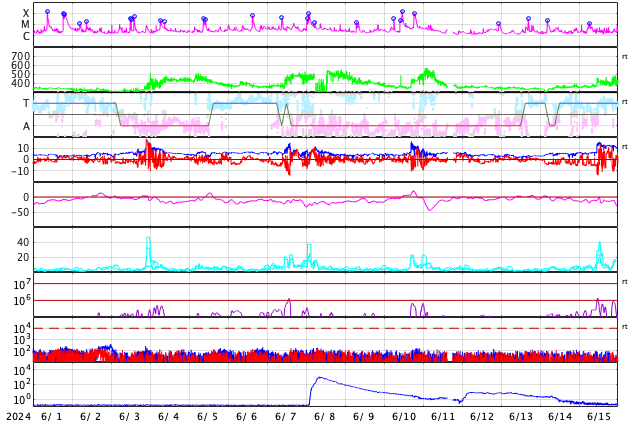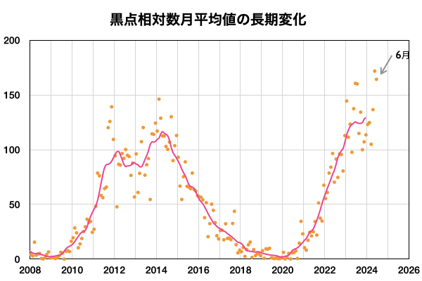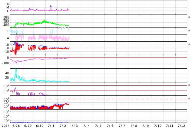 2024/ 7/ 3 09:52 更新 太陽風は低速になっています。6月の黒点相対数は 164.2 でした。 担当 篠原 WDC-SILSOより、6月の黒点相対数は 164.2 と発表されました。 5月の171.7からは下がりましたが、 現在の第25活動周期としては2番目の大きさです。 1日値は、全て100以上になっていて、 5月1日以降、61日連続で3桁が続いています。 可視光写真の動画を見ても、 比較的安定して黒点が見え続けています。 この高まりはどこまで続くでしょうか。 フレアの発生と共に注目を続けて下さい。 現在の太陽は、比較的穏やかな状態です。 フレアは、南西(右下)の3730黒点群で発生した、 C4.7の小規模フレアが最大で、 その他に、C1〜2の小さい小規模フレアが発生した程度です。 太陽風は、速度が420km/秒から360km/秒へ下がり、 低速になっています。 磁場強度は、3nTとやや弱い状態です。 磁場の南北成分は、弱い南寄りになっていますが、 磁気圏への影響は小さく、 AE指数は小さい変化が見られる程度です。 SDO衛星AIA193では、コロナホールは特に見えていません。 太陽風は穏やかな状態が続きそうです。 ![]() 太陽黒点相対数の長期変化。6月の黒点相対数は 164.2 でした。 (c) 黒点データ:WDC-SILSO、作図:宇宙天気ニュース ![]() 6月の太陽黒点の推移。SDO衛星。 (c) SDO衛星AIA193 (NASA)、作図:宇宙天気ニュース ![]() 1975年以降の太陽黒点相対数の長期変化。 (c) 黒点データ:WDC-SILSO、作図:宇宙天気ニュース ![]() SDO衛星のAIA193カメラによる太陽コロナの様子 (c) SDO (NASA) ![]() SDO衛星による太陽の可視光写真。マウスの矢印を写真に重ねると、黒点番号付きの写真に切り替わります。 (c) SDO (NASA) ![]() GOES衛星の太陽X線強度。赤・橙 = 0.1〜0.8 nm、青・紫 = 0.05〜0.4 nm (c) データ:NOAA/SWPC、作図:宇宙天気ニュース ![]() ACEが観測した太陽風の磁場(黒線は全体の強度、赤線は南北成分) 磁場の向き、プラズマの密度、速度、温度 (c) データ:NOAA/SWPC、作図:宇宙天気ニュース ![]() AE指数(速報値) 下段のAEグラフの値が高くなると、オーロラ活動が活発化しています。 (c) 京都大学WDC ![]() ![]() 27日の太陽周期に合わせた図 太陽が同じ面を地球に向けていた27日前の変化から、今後を予想することができます。 (c) 作図:宇宙天気ニュース