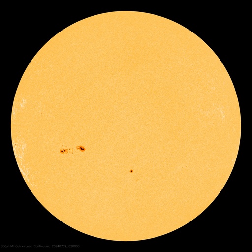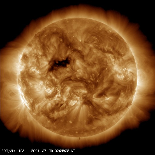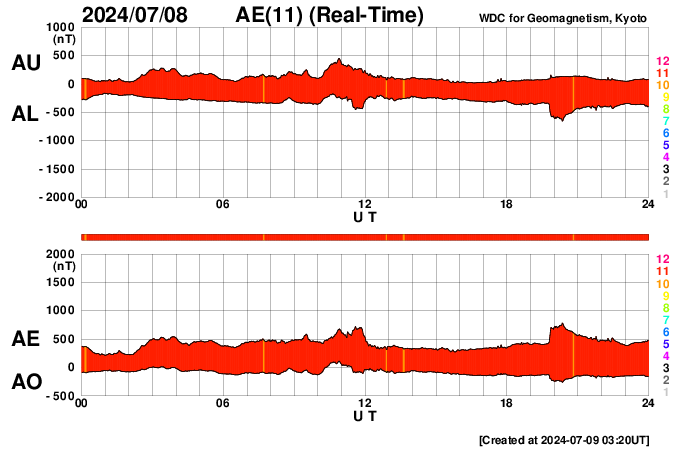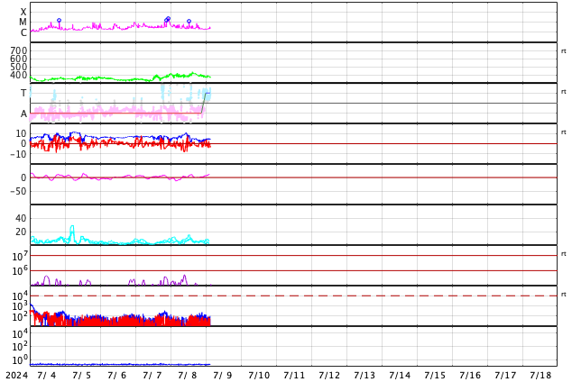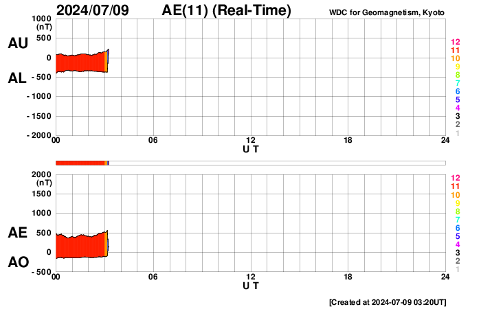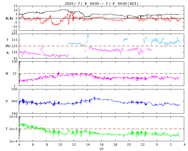 2024/ 7/ 9 12:39 更新 太陽風は平均的な状態です。太陽でフレアが続いています。 担当 篠原 太陽風の速度は、 380〜400km/秒と平均的な状態が続いています。 磁場強度は、上下の変化がありますが、 5nT付近で推移しています。 AE指数のグラフは、一部のデータにエラーがあるようで、 全体的に太くなっています。 グラフの変化を見ると、 時々、小規模の活動が発生している様です。 SDO衛星AIA193では、 北半球の小さいコロナホールが中心線に近付いています。 4日後くらいに影響が見られるでしょうか。 太陽は、南東の端(左下)の領域で、 M1.1の中規模フレアや、 C7.6の小規模フレアなどが発生しています。 激しくはない様子ですが、活動が続いています。 可視光写真では、黒点が見え始めています。 どの様な領域でしょうか。 また、中心部南側の、3738、3736、3740黒点群で、 Cクラスの小規模フレアが度々発生しています。 活動の規模の変化に注意して下さい。