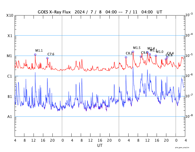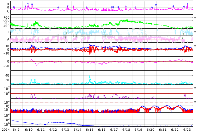 GOES衛星の太陽X線強度。赤・橙 = 0.1〜0.8 nm、青・紫 = 0.05〜0.4 nm (c) データ:NOAA/SWPC、作図:宇宙天気ニュース ![]() | ||||||||||||||||||||||||||||||||||||||||||||||||||||||||||||||||||||||||||||||||||||||||||||||||||||||||||||||||||||||||||||||||||||||||||||||||||||||||||||||||||||||||||||||||||||||||||||||||||||||||||||||||||||||||||||||||||||||||||||||||||||||||||||||||||||||||||||||||||||||||||||||||||||||||||||