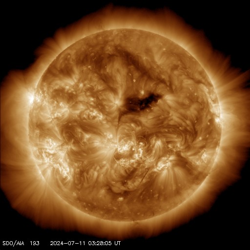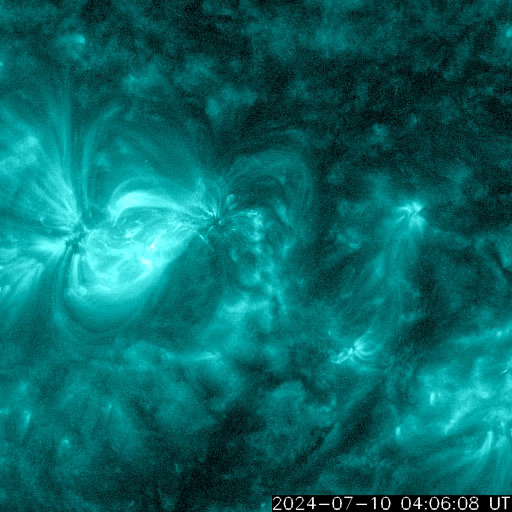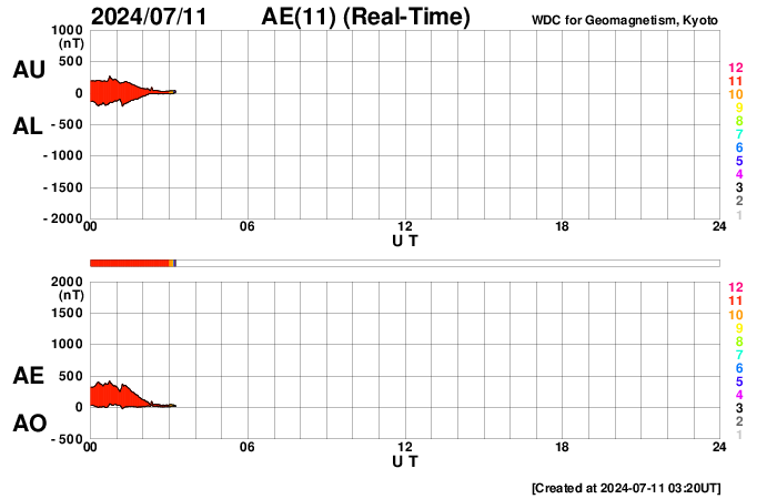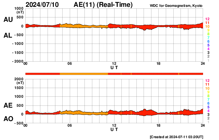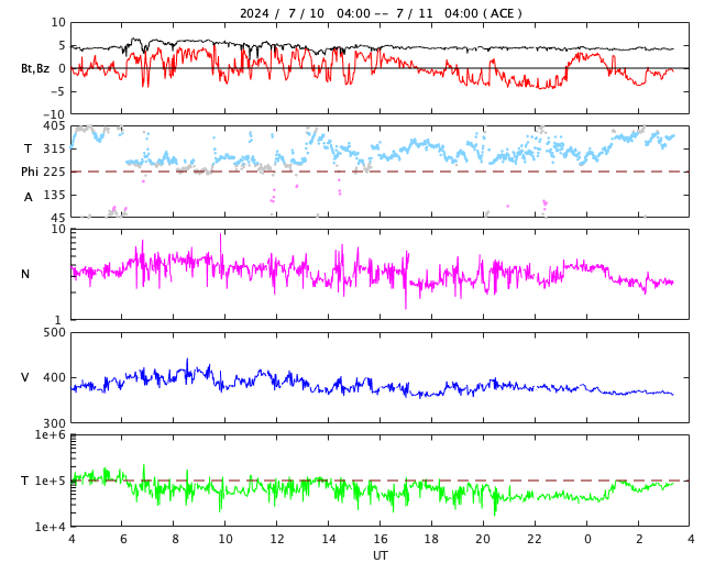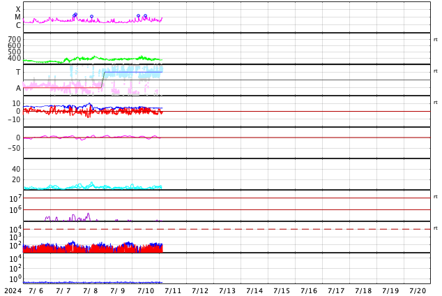 2024/ 7/11 12:37 更新 太陽風は低速の状態です。3738黒点群でMクラスのフレアが続きました。 担当 篠原 太陽風は、速度は370km/秒と低速です。 磁場強度は、4nTと平均的な状態です。 磁場の南北成分は、 グラフの後半で南寄りに変化する様になっています。 このため、AE指数も200〜300nTの 小規模の変化が発生しています。 SDO衛星AIA193では、 北半球のコロナホールが西側に進んでいます。 明後日くらいから太陽風の速度が高まる可能性があります。 太陽は、中心部の3738黒点群で、 昨日の午後から今日未明にかけて、 M1.5、M1.3、M1.4、M1.1、M1.0と 中規模フレアが続きました。 SDO衛星AIA131の動画を掲載します。 今朝以降も、C8.4、C8.6と、 大きめの小規模フレアが発生しています。 この後も活動に注目して下さい。