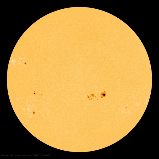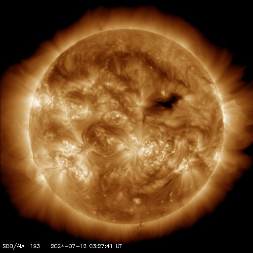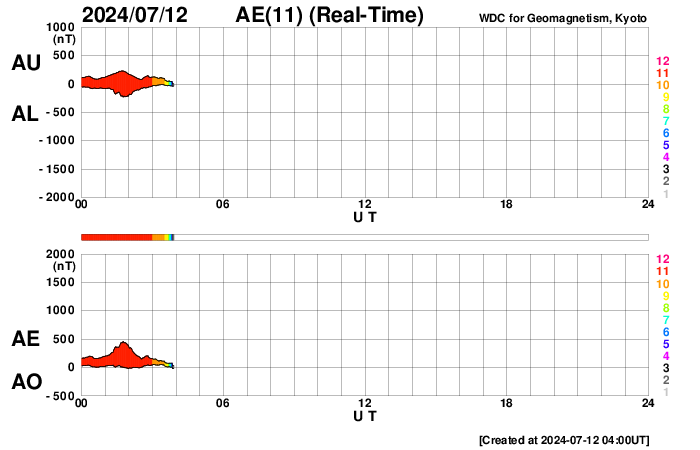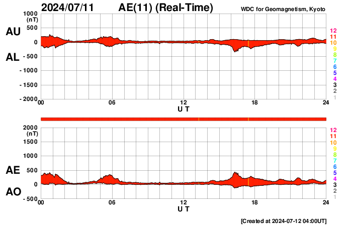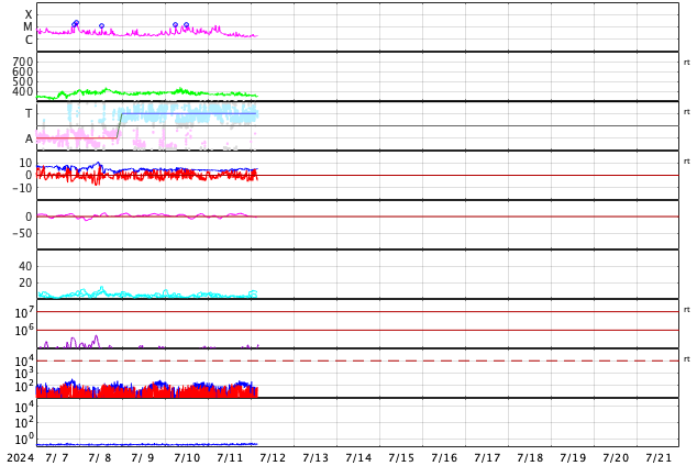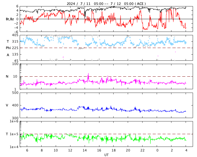 2024/ 7/12 13:14 更新 太陽風は低速の状態が続いています。太陽のフレアは少なくなっています。 担当 篠原 太陽風は、速度が370km/秒から350km/秒へ少し下がり、 より低速になっています。 磁場強度は、5nTと平均的な状態です。 磁気圏は比較的穏やかな状態で、 AE指数は、400nTの小規模の変化が発生した程度です。 SDO衛星AIA193では、 北半球のコロナホールが北西(右上)に進んでいます。 この領域の影響で、 明日くらいから太陽風の速度が高まるかもしれません。 変化はやって来るでしょうか。 太陽の中心部の3738黒点群は、 昨日の午後、11日15時半(世界時11日6時半)に M1.2の中規模フレアを起こしましたが、 以降はC2〜4の小規模フレアを起こした程度で、 活動は弱くなっています。 その他の領域も穏やかな状態で、 X線グラフは変化が見られなくなっています。 ![]() SDO衛星のAIA193カメラによる太陽コロナの様子 (c) SDO (NASA) ![]() SDO衛星による太陽の可視光写真。マウスの矢印を写真に重ねると、黒点番号付きの写真に切り替わります。 (c) SDO (NASA) ![]() ACEが観測した太陽風の磁場(黒線は全体の強度、赤線は南北成分) 磁場の向き、プラズマの密度、速度、温度 (c) データ:NOAA/SWPC、作図:宇宙天気ニュース ![]() AE指数(速報値) 下段のAEグラフの値が高くなると、オーロラ活動が活発化しています。 (c) 京都大学WDC ![]() ![]() 27日の太陽周期に合わせた図 太陽が同じ面を地球に向けていた27日前の変化から、今後を予想することができます。 (c) 作図:宇宙天気ニュース
