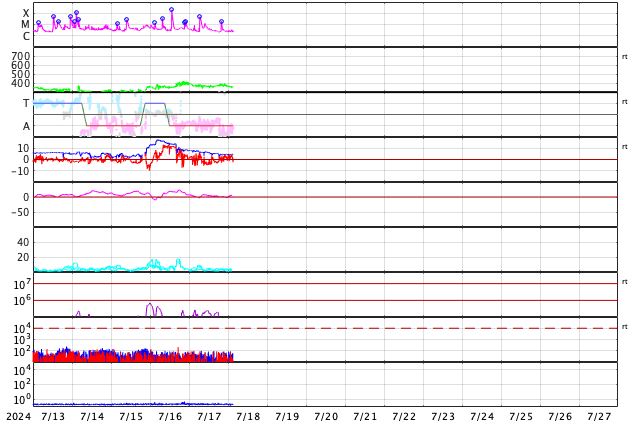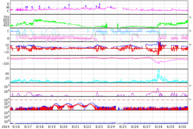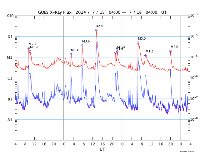 GOES衛星の太陽X線強度。赤・橙 = 0.1〜0.8 nm、青・紫 = 0.05〜0.4 nm (c) データ:NOAA/SWPC、作図:宇宙天気ニュース ![]() | ||||||||||||||||||||||||||||||||||||||||||||||||||||||||||||||||||||||||||||||||||||||||||||||||||||||||||||||||||||||||||||||||||||||||||||||||||||||||||||||||||||||||||||||||||||||||||||||||||||||||||||||||||||||||||||||||||||||||||||||||||||||||||||||||||||||||||||||||||||||||||||||||||||||||||||||||||||||||