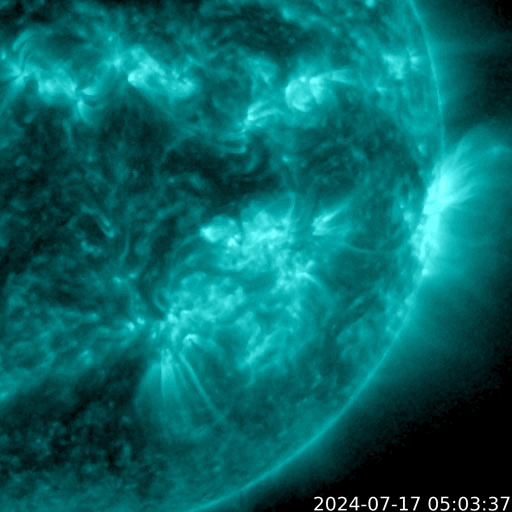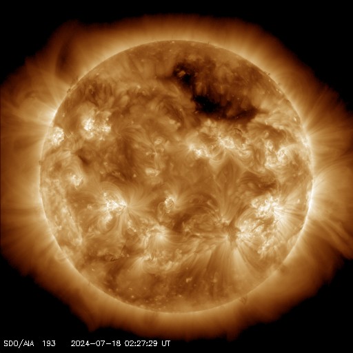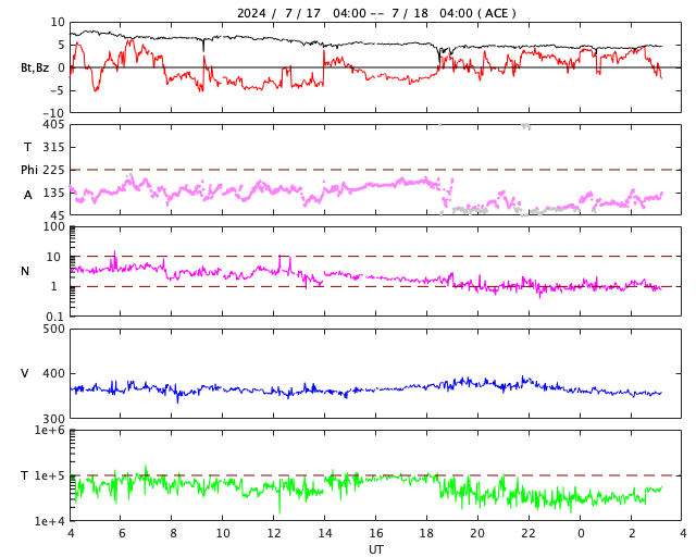 2024/ 7/18 12:25 更新 太陽風は低速の状態が続いています。M5.0の中規模フレアが発生しました。 担当 篠原 太陽風は、360km/秒と低速の風が続いています。 磁場強度は、7nTから4nTに少し下がっていますが、 平均的な状態です。 太陽風磁場の南北成分は、 グラフの前半は弱い南寄りで、 AE指数も500nT程度の中規模の変化が発生しています。 その後は北寄りに変わって、AE指数は変化がなくなり、 現在の磁気圏は穏やかです。 SDO衛星AIA193の太陽コロナ写真では、 コロナホールは北西側(右上)に進んでいます。 この後、太陽風速度の高まりはやって来るでしょうか。 引き続き注目してください。 太陽は、南西(右下)の3743黒点群で、 17日15時半(世界時17日6時半)に、 M5.0とM3.4の中規模フレアが発生しました。 GOES衛星SUVI 131の動画を掲載します。 また、今朝、18日4時半(世界時17日19時半)には、 北西(右上)の3753群で、 M1.2とM2.0の中規模フレアが発生しています。 南東(左下)の3751群も、Cクラスの小規模フレアを起こしていて、 今後の活動に注目して下さい。 ![]() 3743黒点群で発生した、M5.0、M3.4の中規模フレア。 (c) GOES衛星SUVI 131 (NOAA)、(動画加工 : 宇宙天気ニュース) ![]() SDO衛星のAIA193カメラによる太陽コロナの様子 (c) SDO (NASA) ![]() SDO衛星による太陽の可視光写真。マウスの矢印を写真に重ねると、黒点番号付きの写真に切り替わります。 (c) SDO (NASA) ![]() ACEが観測した太陽風の磁場(黒線は全体の強度、赤線は南北成分) 磁場の向き、プラズマの密度、速度、温度 (c) データ:NOAA/SWPC、作図:宇宙天気ニュース ![]() AE指数(速報値) 下段のAEグラフの値が高くなると、オーロラ活動が活発化しています。 (c) 京都大学WDC ![]() ![]() 27日の太陽周期に合わせた図 太陽が同じ面を地球に向けていた27日前の変化から、今後を予想することができます。 (c) 作図:宇宙天気ニュース