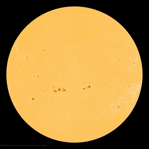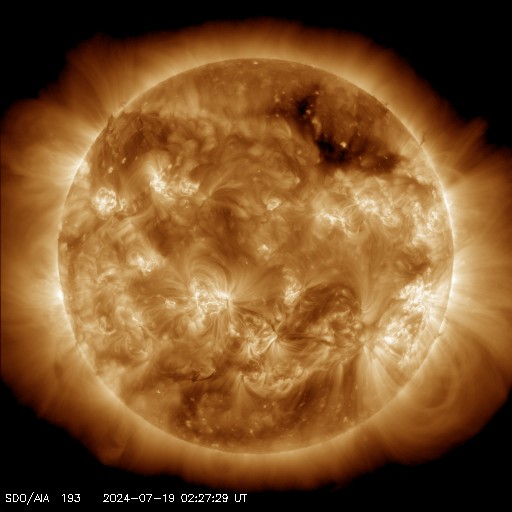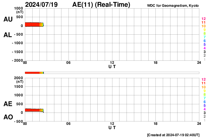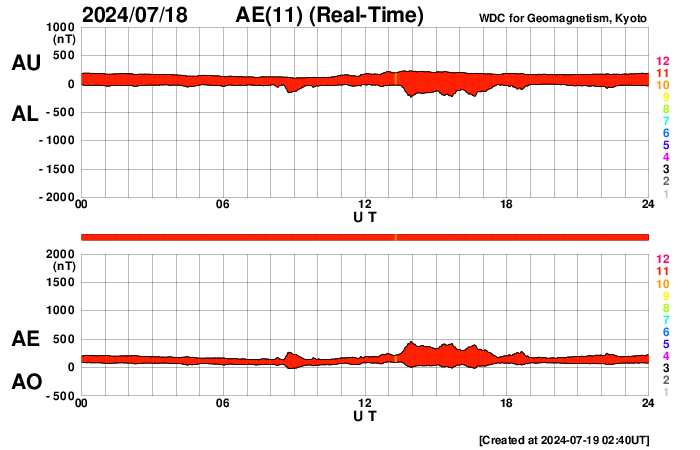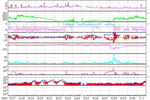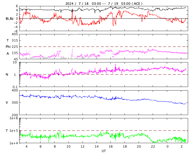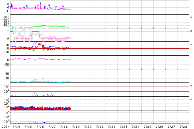 2024/ 7/19 11:57 更新 太陽風はより低速になっています。太陽のフレアはやや穏やかになっています。 担当 篠原 太陽風の速度は、350km/秒から290km/秒へ下がり、 より低速の状態になっています。 SDO衛星AIA193を見ると、 北半球のコロナホールは北西(右上)にだいぶ進んでいます。 この領域の影響は来ないままかもしれません。 太陽風の磁場強度は、4〜5nTと平均的な状態です。 南北成分は、グラフの中心部で南向きになる時間帯があり、 AE指数には300nTの小規模の高まりが発生しています。 その後は、磁場は0nT付近で小さく変化する様になり、 AE指数も変化がなくなって、現在の磁気圏は穏やかです。 SDO衛星AIA193では、 太陽の中心部や東側(左側)にコロナホールは見えていません。 太陽風は穏やかな状態がしばらく続きそうです。 太陽は、中心部南東側(左下)の3751黒点群で、 M2.2、M2.0の中規模フレア、 北東(左上)の3754群でC7.4の小規模フレアなどが発生しています。 X線グラフは変化が少なくなっていて、 全体としては落ち着いている印象です。 可視光写真を見ると、小さい黒点も多いですが、 NOAA/SWPCによる群番号が18群に達しています。 WDC-SILSOによる日々の黒点相対数の速報値、 The estimated international sunspot number では、 16日は 288、18日は 284 という値が発表されています。 今回、第25期の最高値が更新されるかもしれません。