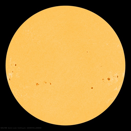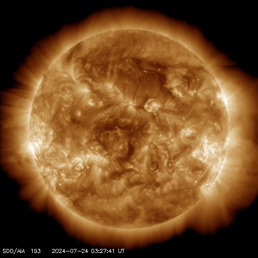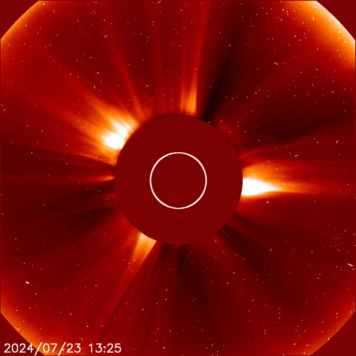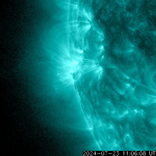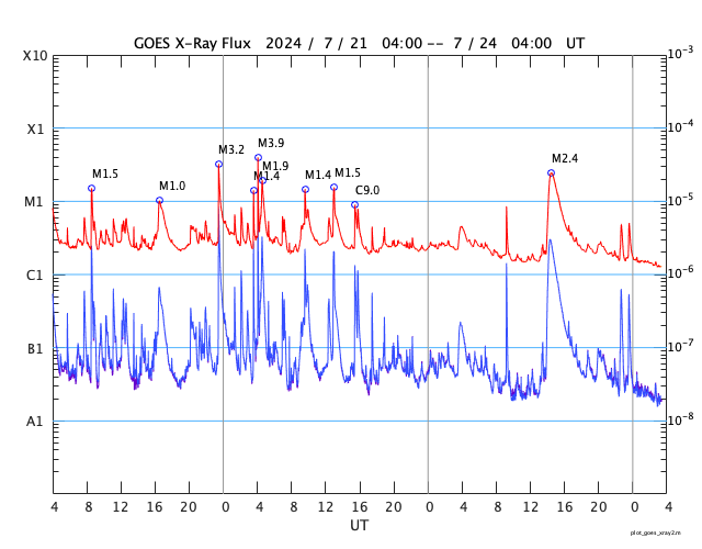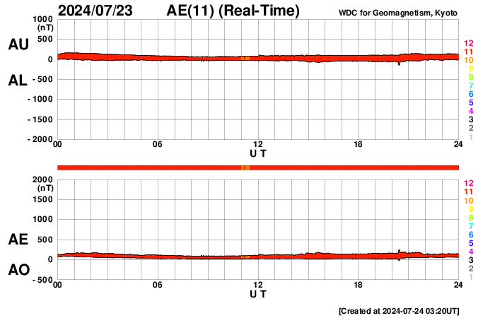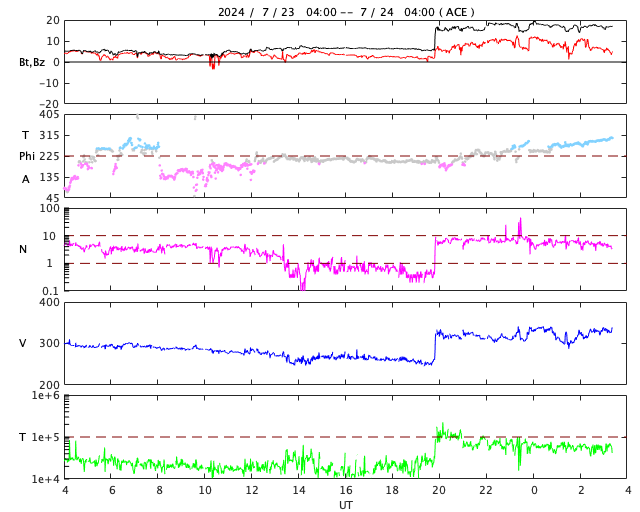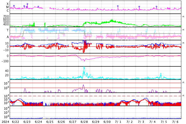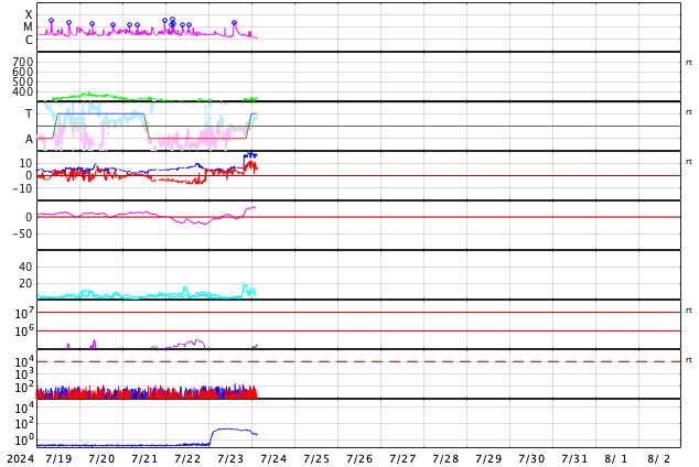 2024/ 7/24 12:37 更新 CMEによる太陽風の乱れが到来しました。磁場は北向きで、磁気圏は穏やかです。 担当 篠原 注目していたCMEによる太陽風の乱れは、 今朝早く、24日4時50分(世界時23日19時50分)頃に ACE衛星で観測されました。 速度の変化は小さく、 その前に250km/秒とかなり低速になっていたのですが、 そこから320km/秒へ高まった程度です。 磁場強度は、5nTと平均的な状態から、 15〜18nTへ強まりました。 磁場の南北成分は、北向きに強まっていて、 +5〜 +10nT程度で推移しています。 このため、磁気圏への影響は小さく、 AE指数は変化のない状態が続いています。 静止軌道のGOES衛星による磁場の北向き成分の観測では、 24日5時20分(世界時23日20時20分)頃に 磁場の急な強まりが発生しています。 太陽風の強まりが地球に達して、 磁気圏を圧縮したことによる変化です。 太陽風磁場の強まりは続いているので、 この状態で南北成分が南向きに切り替わると、 磁気圏の活動がある程度強まる可能性があります。 ただし、速度が低速なので、 変化の規模は限定的になるでしょう。 この後の太陽風の変化に注目してください。 太陽は、昨夜遅く、23日23時(世界時23日14時)に、 東端(左端)の3765黒点群で、 M2.4の中規模フレアが発生しています。 SDO衛星AIA131の動画を掲載します。 このフレアに伴って、 CME(コロナ質量放出)が太陽の左側へ飛び出しています。 SOHO衛星の画像が整っていないため、 LASCO C2による部分的な動画を掲載します。 横向きの噴出なので、地球への影響はなさそうです。 昨日増加が始まっていた高エネルギーの陽子は、 昨日の午後にピークに達し、現在は減少しています。