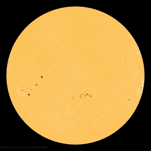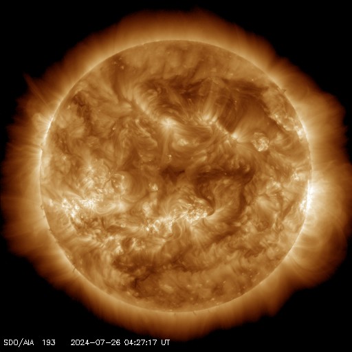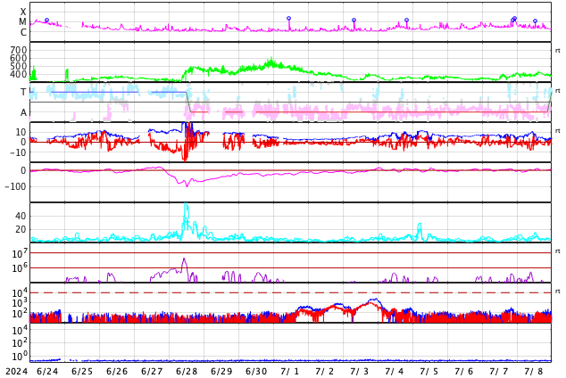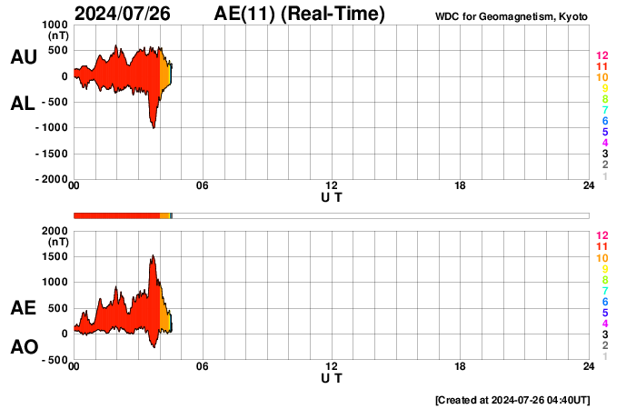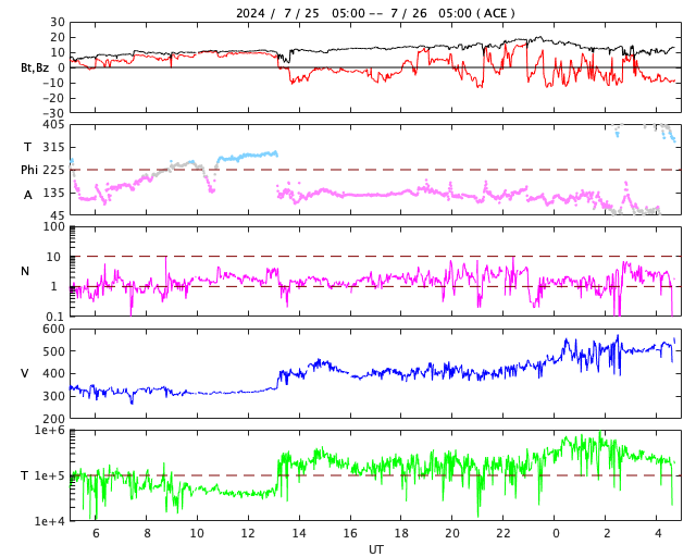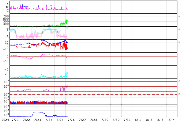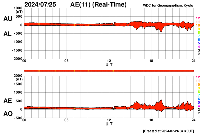 2024/ 7/26 13:55 更新 太陽風の速度が高まり、磁気圏の活動が強まっています。 担当 篠原 太陽風は、320km/秒と低速の状態でしたが、 昨夜、25日22時(世界時25日13時)に400km/秒へ上がり、 その後も上昇が続いて、 現在は500km/秒と高速の風に変わっています。 磁場強度も強まっていて、 10nTから一時20nTに強まり、 その後10nTに戻る変化をしています。 磁場の南北成分は、グラフの初めは北寄りでしたが、 後半は南北に変化する様になり、 磁場が強まっていることもあって、 -10nTに達する大きい南向きの変化が発生しています。 速度の高まりも重なって、 磁気圏の活動は次第に活発になっています。 AE指数は、途中から500nTの変化が続く様になり、 最後は1500nTと大きい変化が発生しています。 この後も活動は続くでしょうか。 太陽風の推移と共に注目して下さい。 太陽は、西の端(右端)に達した3751黒点群で、 深夜、26日0時半(世界時25日15時半)に M1.3の中規模フレアが発生しました。 現在は向こう側に進んで、見えなくなっています。 こちら側の領域では目立った変化は起きていません。 太陽は、穏やかになりそうです。