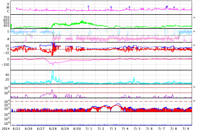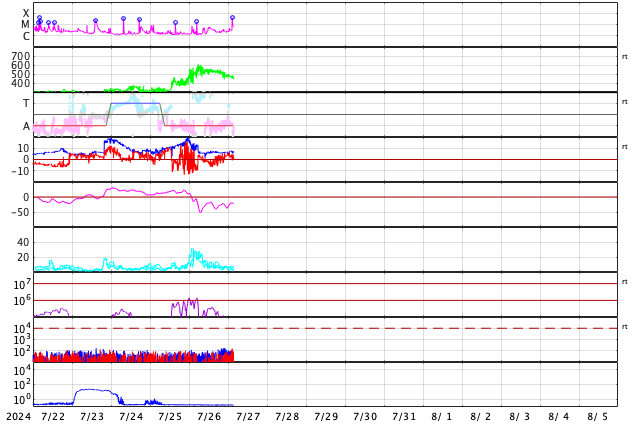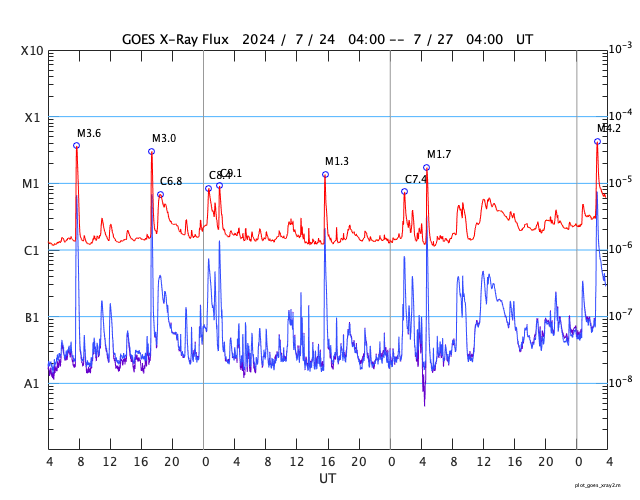 GOES衛星の太陽X線強度。赤・橙 = 0.1〜0.8 nm、青・紫 = 0.05〜0.4 nm (c) データ:NOAA/SWPC、作図:宇宙天気ニュース ![]() | |||||||||||||||||||||||||||||||||||||||||||||||||||||||||||||||||||||||||||||||||||||||||||||||||||||||||||||||||||||||||||||||||||||||||||||||||||||||||||||||||||||||||||||||||||||||||||||||||||||||||||||||||||||||||||||||||||||||||||||||||||||||||||||||||||||||||||||||||||||||||||||||||||