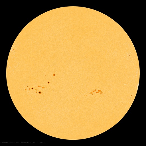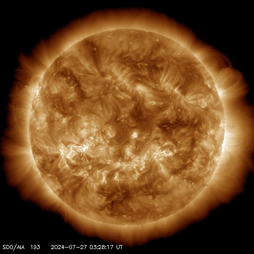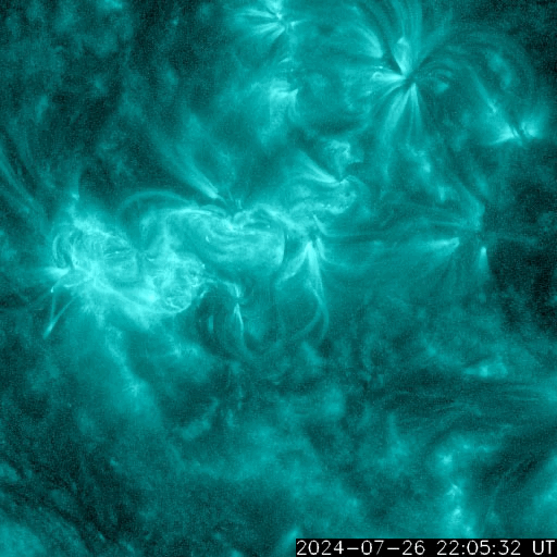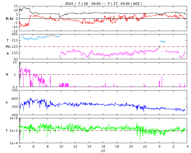 2024/ 7/27 12:58 更新 太陽風は平均的な速度に戻っています。磁気圏も穏やかです。 担当 篠原 太陽風の速度は、 昨日のニュースの後に550km/秒に高まりました。 その後はゆっくりと下がり、 現在は460km/秒と平均的な速さに戻っています。 太陽風の磁場強度は、6〜7nTと平均的な状態です。 南北成分は、グラフの中盤は南寄りで、 AE指数は500nTを超えるくらいの中規模の変化が続きました。 グラフの後半では、磁場は北寄りになり、 磁気圏は穏やかになっています。 太陽は、中心部南東側(左下)の3766黒点群で、 27日11時半(世界時27日2時半)に、 M4.2の中規模フレアが発生しました。 左下の3765群で直前に発生した C4.9の小規模フレアと合わせて SDO衛星AIA131の動画を掲載します。 この周辺は黒点が多く見えています。 今後の活動に注目してください。 ![]() 3766黒点群で発生した、M4.2の中規模フレア。 (c) SDO衛星AIA131 (NASA)、(動画加工 : 宇宙天気ニュース) ![]() SDO衛星のAIA193カメラによる太陽コロナの様子 (c) SDO (NASA) ![]() SDO衛星による太陽の可視光写真。マウスの矢印を写真に重ねると、黒点番号付きの写真に切り替わります。 (c) SDO (NASA) ![]() ACEが観測した太陽風の磁場(黒線は全体の強度、赤線は南北成分) 磁場の向き、プラズマの密度、速度、温度 (c) データ:NOAA/SWPC、作図:宇宙天気ニュース ![]() AE指数(速報値) 下段のAEグラフの値が高くなると、オーロラ活動が活発化しています。 (c) 京都大学WDC ![]() ![]() 27日の太陽周期に合わせた図 太陽が同じ面を地球に向けていた27日前の変化から、今後を予想することができます。 (c) 作図:宇宙天気ニュース