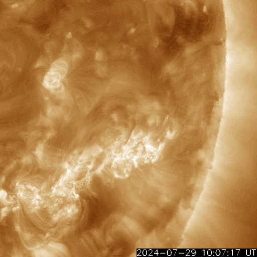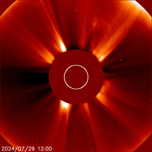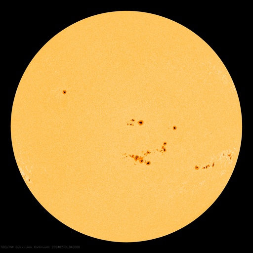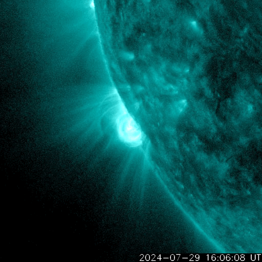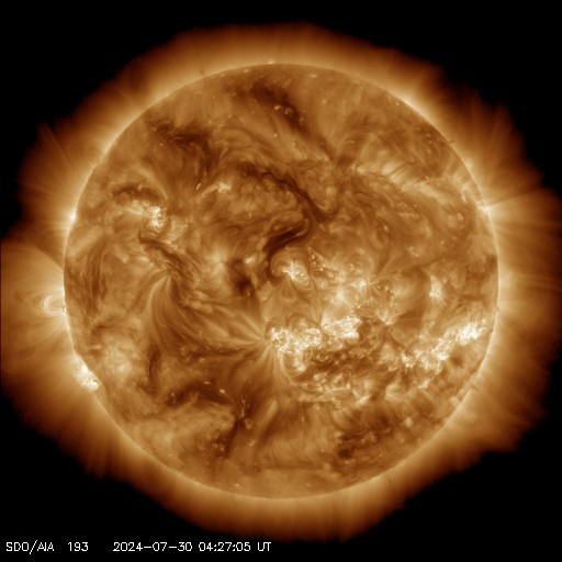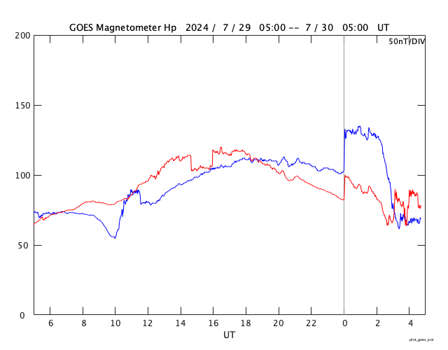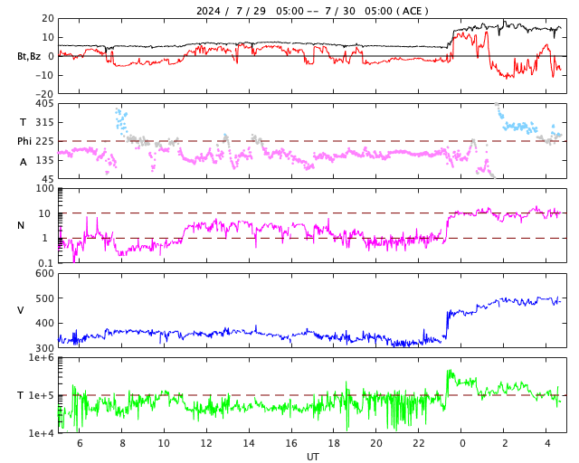 2024/ 7/30 13:52 更新 太陽風の乱れが到来しました。中規模フレアやCMEの発生が続いています。 担当 篠原 今朝、30日8時半(世界時29日23時半)に、 ACE衛星で太陽風の急な強まりが観測されました。 速度は、330km/秒と低速の状態から、 450km/秒、やがて480km/秒とやや高速になり、 磁場強度は、5nTと平均的な状態から、 15nTに強まっています。 この強まりが地球に達して磁気圏を圧縮したことにより、 30日9時(世界時30日0時)に静止衛星であるGOES衛星で、 磁場の急な強まりが観測されています。 この変化が、 27日午後に発生したCME(コロナ質量放出)による乱れだとすると、 2日半ほどで地球に達したことになります。 NOAA/SWPCの最新の太陽風予報では、 変化の到来は30日17時(世界時30日8時)となっていました。 タイミングにずれはありますが、 その後に発生が続いた複数のCMEによる乱れが 次々に地球に到来する様子を示しています。 この後も太陽風の変化に注目して下さい。 太陽風磁場の南北成分は、 乱れの到来直後は北向きに強まりましたが、 2時間ほどで南向きに反転し、 -10nTに達する強い南向きが発生しています。 しかし、その変化も2時間ほどで終わって、 グラフの最後は一旦北向きに切り替わっています。 磁気圏の活動は南向きになった短い時間だけ強まることになり、 AE指数は、グラフの最後に1300nTの大きい変化が発生しています。 この後、別のCMEの影響も含めて 磁場の南北成分はどの様に推移するでしょうか、 磁気圏活動への影響が変わるので注目して下さい。 太陽は、昨日のニュース以降も Mクラスの中規模フレアが続いています。 29日22時(世界時29日13時)に、南西側(右下)の3762黒点群で M8.7と大きい中規模フレアが発生しました。 SDO衛星AIA193の動画を掲載します。 このフレアに伴って、フレアの領域のすぐ北側(上側)にあった ダークフィラメントの噴出が発生しています。 動画ではコロナのガスが激しく動く様子が見えています。 そして、直後の29日23時半(世界時29日14時半)には、 南側(下側)の領域でフィラメント噴出が発生しています。 動画の後半の噴出がこの変化です。 これにより、2つのCMEが右上寄りと右下寄りに飛び出しています。 SOHO衛星LASCO C2、C3の動画をご覧下さい。 掲載しているNOAA/SWPCの太陽風予報の動画の最後の噴出は、 これらのCMEの乱れではないかと思います。 この変化が地球に達するのは、明後日、8月1日の昼頃の様です。 この他に、29日23時(世界時29日14時)に 中心部の3765群でM4.2、 30日4時半(世界時29日19時半)に、 南東の端(左下)でM6.4などの中規模フレアが発生しています。 南東の端のM6.4フレアの動画も掲載します。 可視光写真では、黒点が現れています。 この後も活動は続くでしょうか。