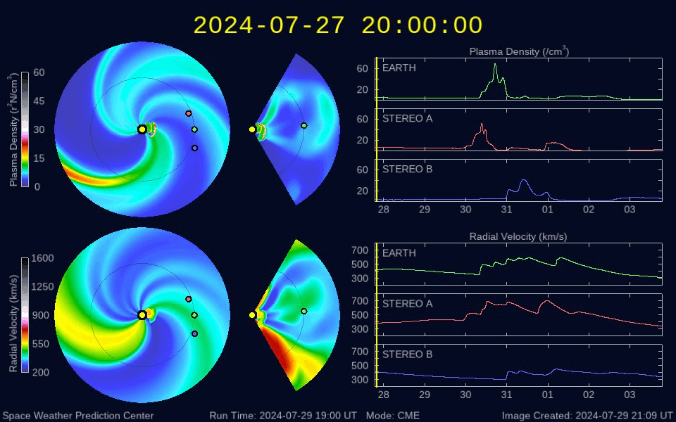 (c) データ:NOAA/SWPC、作図:宇宙天気ニュース ![]() 複数のCMEの発生により、太陽風の乱れが次々にやって来ます。 (c) NOAA/SWPC、(動画加工 : 宇宙天気ニュース) ![]() 3762黒点群で発生したM8.7の中規模フレアと、南側で発生したフィラメント噴出。 (c) SDO衛星AIA193 (NASA)、(動画加工 : 宇宙天気ニュース) ![]() 右上寄りと右下寄りにCMEが飛び出しています。 (c) SOHO衛星LASCO C2、C3 (ESA & NASA)、(動画加工 : 宇宙天気ニュース) ![]() 南東の端で発生したM6.4の中規模フレア。 (c) SDO衛星AIA131 (NASA)、(動画加工 : 宇宙天気ニュース) ![]() SDO衛星のAIA193カメラによる太陽コロナの様子 (c) SDO (NASA) ![]() SDO衛星による太陽の可視光写真。マウスの矢印を写真に重ねると、黒点番号付きの写真に切り替わります。 (c) SDO (NASA) ![]() ACEが観測した太陽風の磁場(黒線は全体の強度、赤線は南北成分) 磁場の向き、プラズマの密度、速度、温度 (c) データ:NOAA/SWPC、作図:宇宙天気ニュース ![]() AE指数(速報値) 下段のAEグラフの値が高くなると、オーロラ活動が活発化しています。 (c) 京都大学WDC ![]() ![]() 27日の太陽周期に合わせた図 太陽が同じ面を地球に向けていた27日前の変化から、今後を予想することができます。 (c) 作図:宇宙天気ニュース