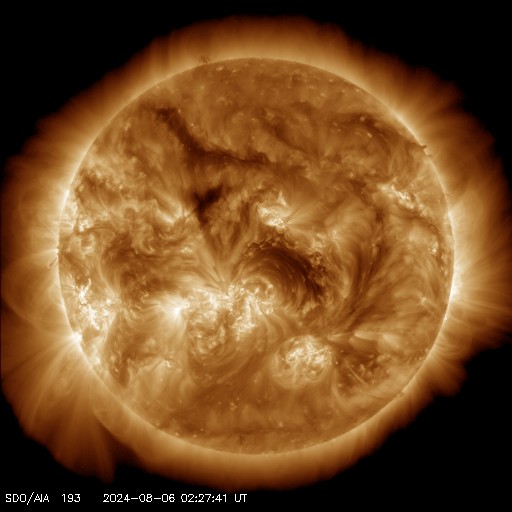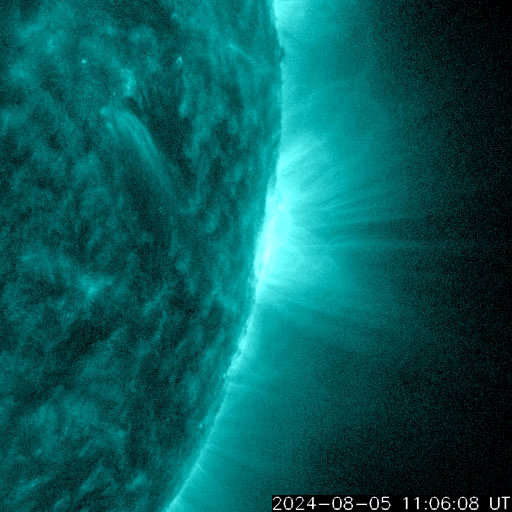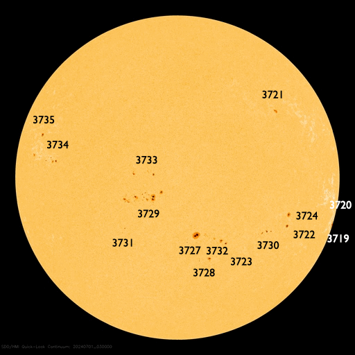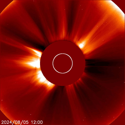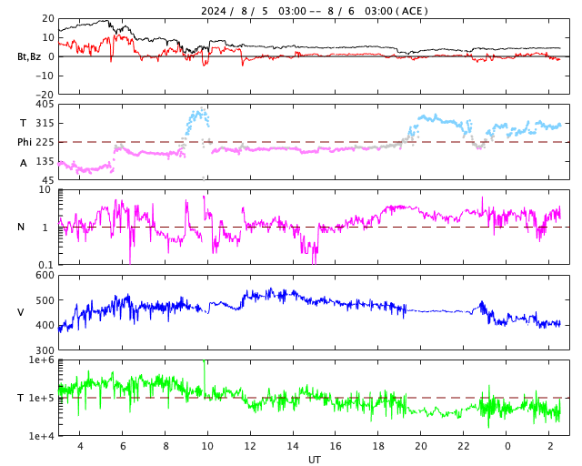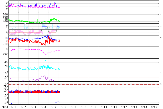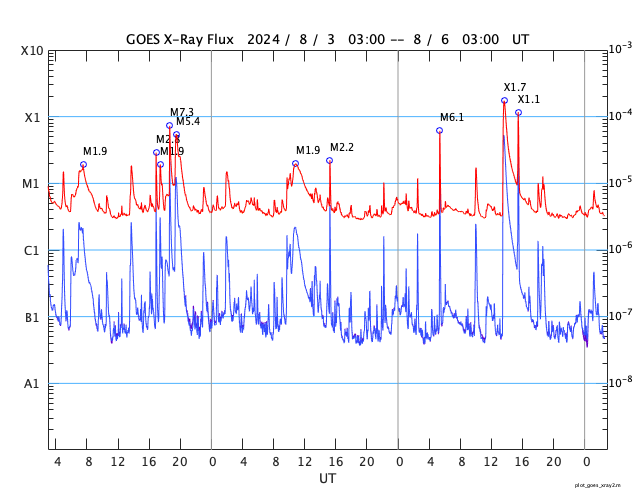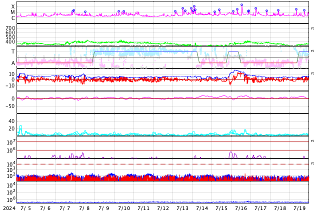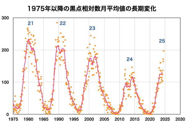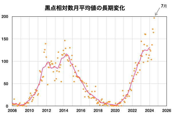 2024/ 8/ 6 11:42 更新 X1.7の大規模フレアが発生しました。7月の黒点相対数は 196.5 でした。 担当 篠原 WDC-SILSOより、7月の黒点相対数は 196.5 と発表されました。 これは、2024年5月の 171.7 を大きく上回り、 現在の第25活動周期の月平均値の最高値を更新しました。 1枚目の図を見ると、 今回の値が今期の中で一段高まっていることが分かります。 2枚目の図を参照すると、月平均値がこの値に達したのは、 第23期の極大の頃である2001年12月の 213.4 以来です。 第23期でも今回の値を超えていたのは、 1999年6月の 207.2、2000年3月の 217.7、 2000年7月の 244.3、2001年6月の 202.9、 2001年9月の 238.2 と、計6回だけです。 また、1日値は、7月18日に 290 に達しています。 これも第25期の最高値で、 これまでは2024年4月23日の 266 が最高値でした。 3枚目に、1か月の可視光写真の動画を掲載していますが、 中ほどに黒点群がとても多くなっている画像が見えています。 (この日のニュースで、太陽画像をどうぞ) NOAA/SWPCの黒点群のリストでは、 翌日の7月19日の報告書では、黒点群は18群に達していました。 今期の太陽活動は、どこまで高まるでしょうか。 注目を続けて下さい。 太陽は、昨夜、5日22時半(世界時5日13時半)に、 西の端(右端)の向こう側に進んだ3767黒点群で、 X1.7の大規模フレアが発生しました。 Xクラスのフレアの発生は7月29日のX1.5以来で、 一週間ぶりです。 SDO衛星AIA131の動画を掲載します。 フレアは一部が見えていないので、 本当の規模はこれよりも大きかった可能性があります。 このフレアに伴って、 太陽の右側に広がるCME(コロナ質量放出)が発生しています。 SOHO衛星LASCO C2、C3の動画を掲載します。 横向きの噴出ですが、広がり方が大きく、 地球へも弱い影響がやって来るかもしれません。 また、この動画では太陽の左側にもCMEが飛び出しています。 対応する変化が見えないので、 太陽の向こう側の現象ではないかと思います。 太陽のこちら側では、南東(左下)の3780黒点群で、 M6.1、X1.1、M1.2と、 中規模、大規模のフレアが発生しています。 太陽風は、昨日のニュースの後、 速度が400km/秒台に上がり、 夜には500km/秒と高速になりました。 今日に入ると低下して、 現在は400km/秒と平均的な速度に戻っています。 磁場強度は、昨日の夕方には5nTと平均的な値に下がり、 現在もこの状態です。 磁場の南北成分は、0nT付近で小さく変化しています。 磁気圏は概ね静穏で、AE指数は小規模の変化が起きている程度です。 ![]() 太陽黒点相対数の長期変化。7月の黒点相対数は 196.5 でした。 (c) 黒点データ:WDC-SILSO、作図:宇宙天気ニュース ![]() 1975年以降の太陽黒点相対数の長期変化。 (c) 黒点データ:WDC-SILSO、作図:宇宙天気ニュース ![]() 7月の太陽黒点の推移。SDO衛星。 (c) SDO衛星AIA193 (NASA)、作図:宇宙天気ニュース ![]() 3767黒点群で発生した、X1.7の大規模フレア。 (c) SDO衛星AIA131 (NASA)、(動画加工 : 宇宙天気ニュース) ![]() 太陽の右側へ広がるCME。 (c) SOHO衛星LASCO C2、C3 (ESA & NASA)、(動画加工 : 宇宙天気ニュース) ![]() SDO衛星のAIA193カメラによる太陽コロナの様子 (c) SDO (NASA) ![]() SDO衛星による太陽の可視光写真。マウスの矢印を写真に重ねると、黒点番号付きの写真に切り替わります。 (c) SDO (NASA) ![]() GOES衛星の太陽X線強度。赤・橙 = 0.1〜0.8 nm、青・紫 = 0.05〜0.4 nm (c) データ:NOAA/SWPC、作図:宇宙天気ニュース ![]() ACEが観測した太陽風の磁場(黒線は全体の強度、赤線は南北成分) 磁場の向き、プラズマの密度、速度、温度 (c) データ:NOAA/SWPC、作図:宇宙天気ニュース ![]() AE指数(速報値) 下段のAEグラフの値が高くなると、オーロラ活動が活発化しています。 (c) 京都大学WDC ![]() ![]() 27日の太陽周期に合わせた図 太陽が同じ面を地球に向けていた27日前の変化から、今後を予想することができます。 (c) 作図:宇宙天気ニュース