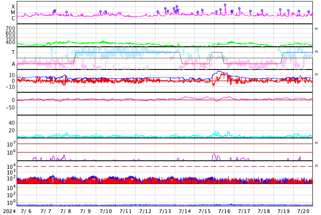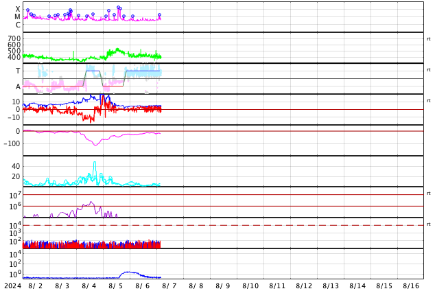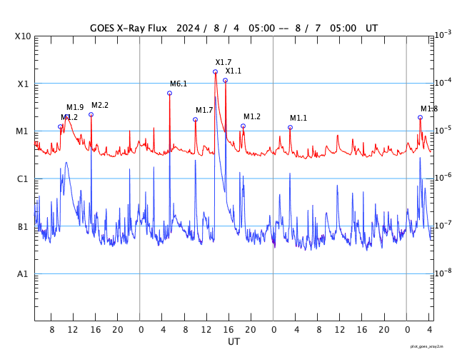 GOES衛星の太陽X線強度。赤・橙 = 0.1〜0.8 nm、青・紫 = 0.05〜0.4 nm (c) データ:NOAA/SWPC、作図:宇宙天気ニュース ![]() | ||||||||||||||||||||||||||||||||||||||||||||||||||||||||||||||||||||||||||||||||||||||||||||||||||||||||||||||||||||||||||||||||||||||||||||||||||||||||||||||||||||||||||||||||||||||||||||||||||||||||||||||||||||||||||||||||||||||||||||||||||||||||||||||||||||||||||||||||||||||||||||||||||||||||||||||||||||||||||||||||||||