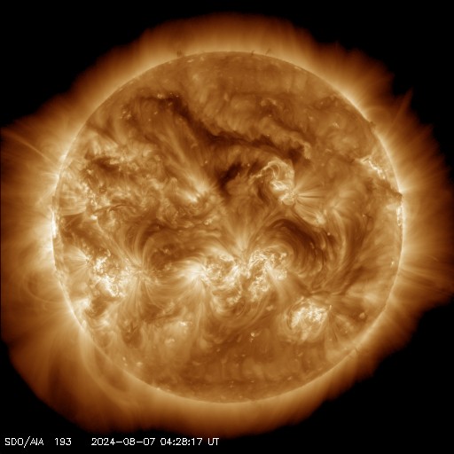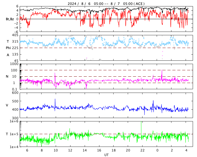 2024/ 8/ 7 13:40 更新 太陽風は平均的な状態で、磁気圏は穏やかです。 担当 篠原 太陽風は、速度は400km/秒、磁場強度は5nTと どちらも平均的な状態です。 磁場の南北成分は、南向きの変化もありますが、 比較的北寄りになっている印象です。 磁気圏は穏やかに推移していて、 AE指数は、小規模の変化が見られる程度です。 SDO衛星AIA193の太陽コロナ写真では、 コロナホールは特に見えていない様です。 太陽風は穏やかに推移しそうです。 太陽は、Mクラスの中規模フレアの発生が少なくなり、 昨日のニュースの直後、6日12時(世界時6日3時)に 北東(左上)の3781黒点群で発生したM1.1の後は、 1日経った今日の昼、7日11時半(世界時7日2時半)に、 中心部南側の3774群でM1.8が発生しただけです。 3774群では、この他にも C8.1、C6.8、C7.9などの小規模フレアが発生しています。 ![]() SDO衛星のAIA193カメラによる太陽コロナの様子 (c) SDO (NASA) ![]() SDO衛星による太陽の可視光写真。マウスの矢印を写真に重ねると、黒点番号付きの写真に切り替わります。 (c) SDO (NASA) ![]() ACEが観測した太陽風の磁場(黒線は全体の強度、赤線は南北成分) 磁場の向き、プラズマの密度、速度、温度 (c) データ:NOAA/SWPC、作図:宇宙天気ニュース ![]() AE指数(速報値) 下段のAEグラフの値が高くなると、オーロラ活動が活発化しています。 (c) 京都大学WDC ![]() ![]() 27日の太陽周期に合わせた図 太陽が同じ面を地球に向けていた27日前の変化から、今後を予想することができます。 (c) 作図:宇宙天気ニュース