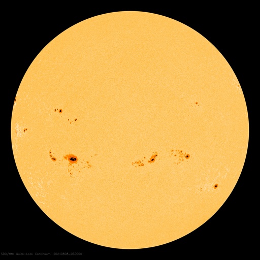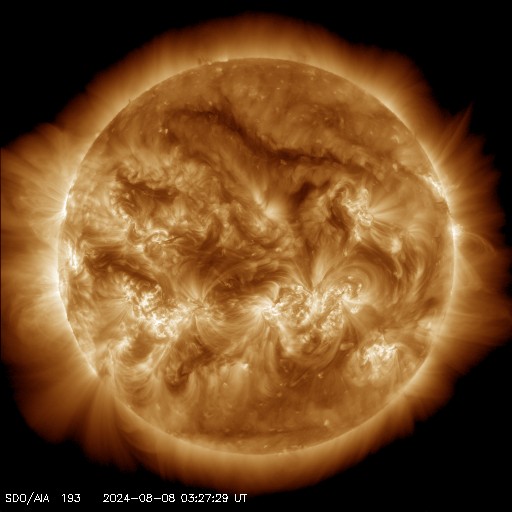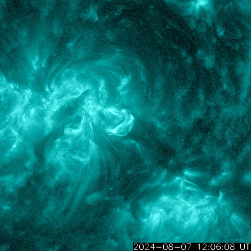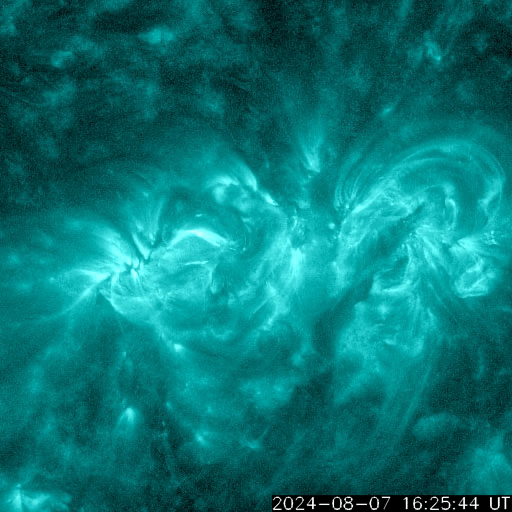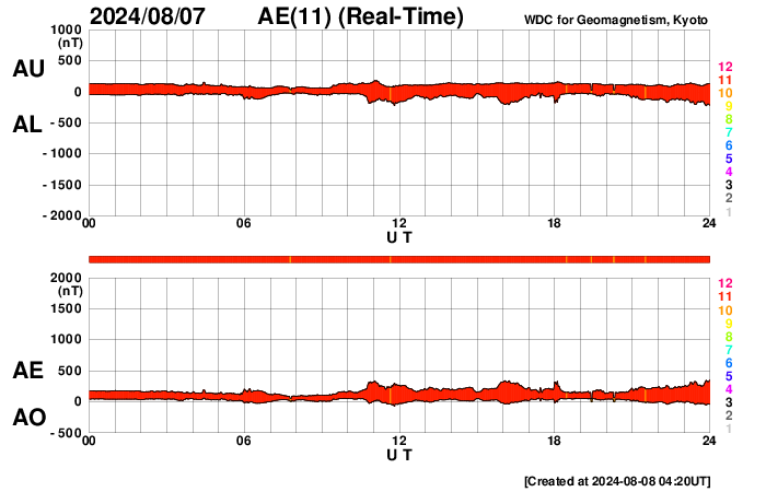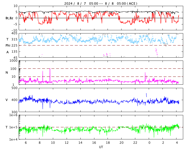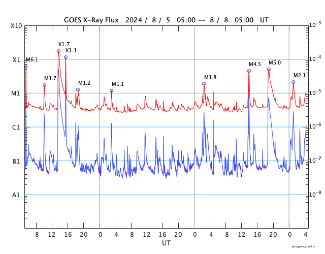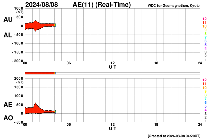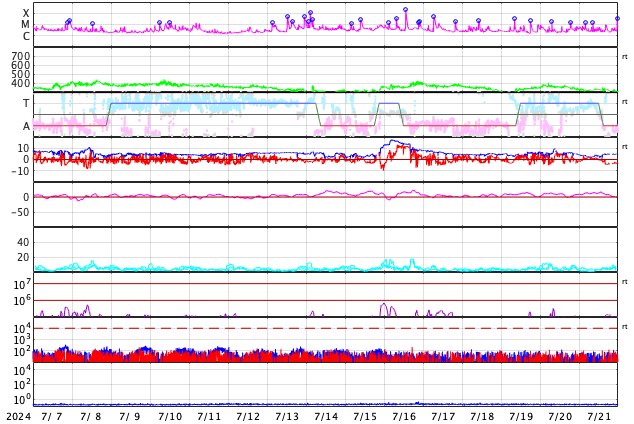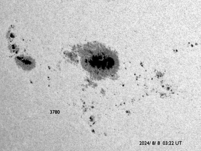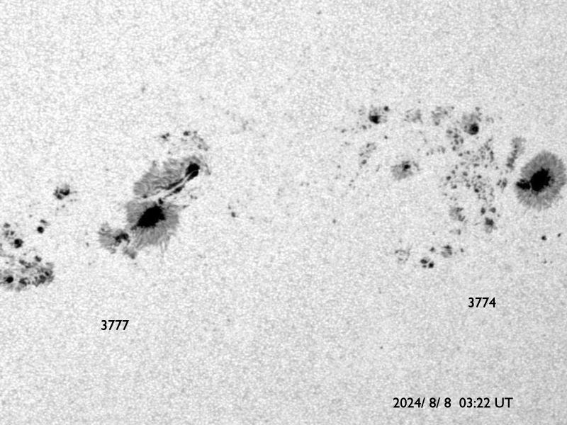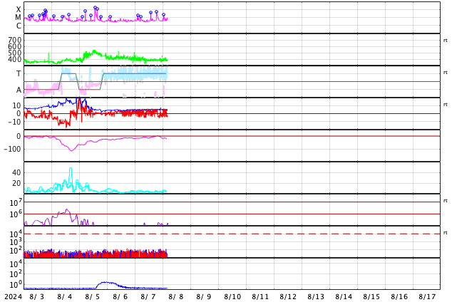 2024/ 8/ 8 13:33 更新 Mクラスのフレアが続く様になっています。太陽風はやや低速です。 担当 篠原 太陽で、Mクラスの中規模フレアの発生が続く様になっています。 1枚目の動画は、 昨夜、7日22時半(世界時7日13時半)に、 中心部南西側(右下)の3774黒点群で発生したM4.5。 2枚目の動画は、 今日未明、8日3時半(世界時7日18時半)に、 中心部南側(下側)の3777黒点群で発生したM5.0です。 3777群では、8日10時(世界時8日1時)にも、 M2.1の中規模フレアが発生しています。 2つの黒点群の様子を、SDO衛星の可視光写真で紹介します。 東西の広がりが大きいので、掲載の画像では、 3774群の右側と3777群の左側が切れています。 また、南東(左下)には、3780群が大きい姿を見せています。 可視光の拡大写真を掲載します。 この領域では、C4.5、C7.4、C8.0などの 小規模フレアが発生しています。 北東(左上)の3781群でも、 C5.3、C7.9などの小規模フレアが発生しています。 これらの領域のこの後の活動に注目して下さい。 太陽風は、速度が400km/秒から380km/秒へ少し下がり、 やや低速になっています。 磁場強度は、5nTと平均的な状態が続いています。 磁気圏は比較的穏やかな状態で、 AE指数は、小規模の変化が発生する程度です。