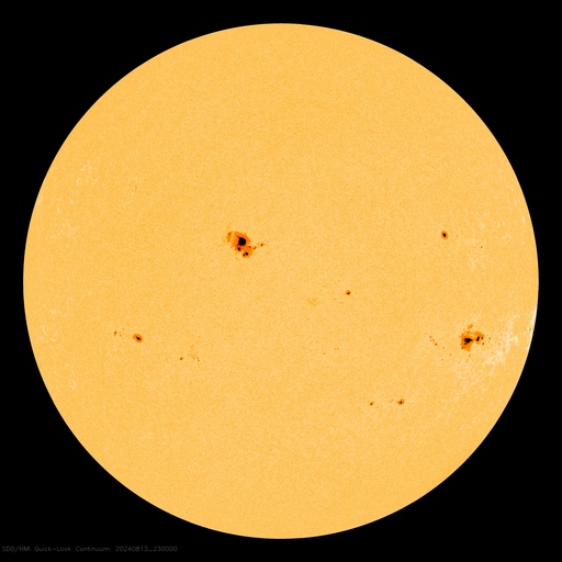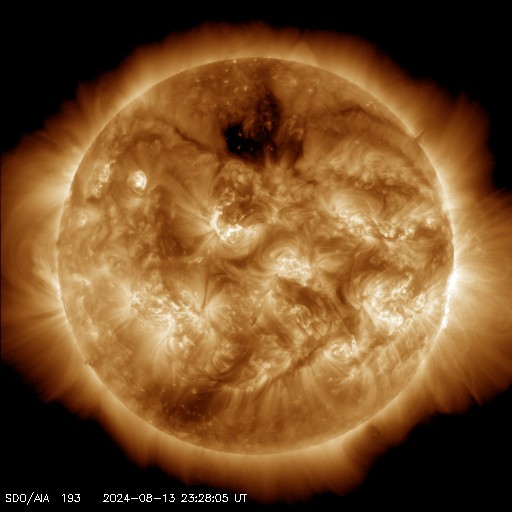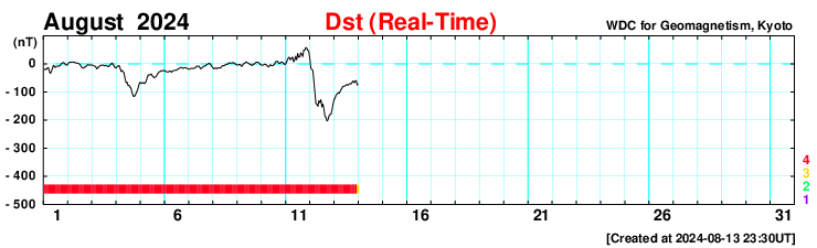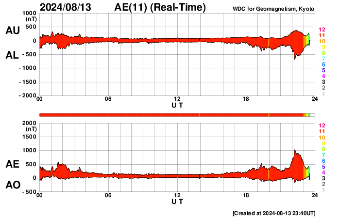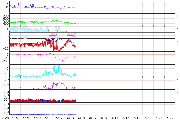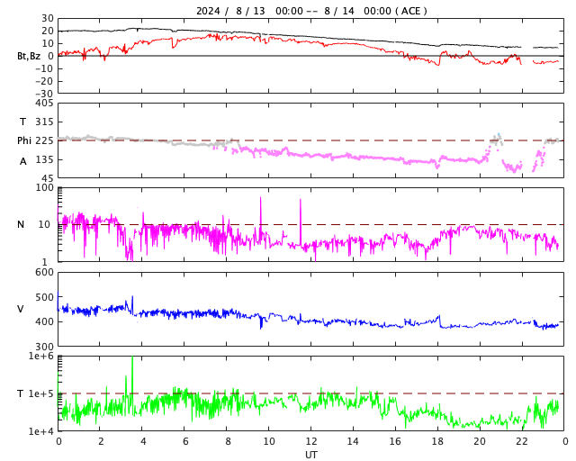 2024/ 8/14 08:57 更新 太陽風磁場の強まりは終わり、磁気圏は穏やかになりました。 担当 篠原 昨日のニュースの後、太陽風磁場の南北成分は北向きに強まり、 磁気圏の活動は穏やかになりました。 AE指数は、グラフの中盤にかけて 変化のない状態が続いています。 Dst指数も、昨日の-203nTが最大の変化で、 その後は値が上がって、変化が小さくなっています。 太陽風の速度は、450km/秒から400km/秒に下がり、 現在は平均的な状態です。 20nTに強まっていた磁場強度は、 昨日の夕方くらいから下がり始め、 現在は6nTとこちらも平均的な状態です。 磁場の南北成分は、 昨日の夕方に、+15nTと北向きに強まりましたが、 その後下がって行き、 今日未明からは再び -5nT程度の南向きの変化が続く様になっています。 このため、磁気圏の活動も再び強まって、 AE指数は1000nTに達する大きい変化が発生しています。 ただし、現在は太陽風の速度も磁場強度も下がっているので、 激しい乱れには発達しません。 太陽風の乱れは落ち着きましたが、 SDO衛星AIA193を見ると、 北半球の中緯度域にコロナホールが見えています。 27日前の前周期は太陽風への影響はなかったのですが、 今回はどうでしょうか。 3〜4日後の太陽風に注目してください。 太陽では、昨日の夕方くらいから、 中心部北側の3784黒点群でフレアが続く様になっています。 M1.0の中規模フレアを最大に、 C7.3、C8.3、C7.3、C7.7などの小規模フレアが 発生しています。 とニュースを書いているところで、 14日8時半(世界時13日23時半)に、 3784群でM4.2の中規模フレアが発生しました。 この後の活動に注目してください。