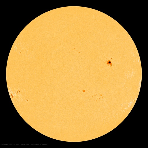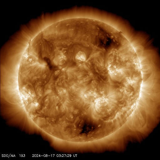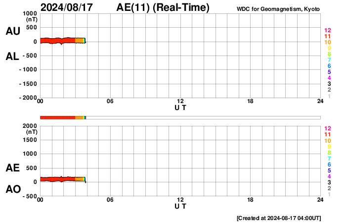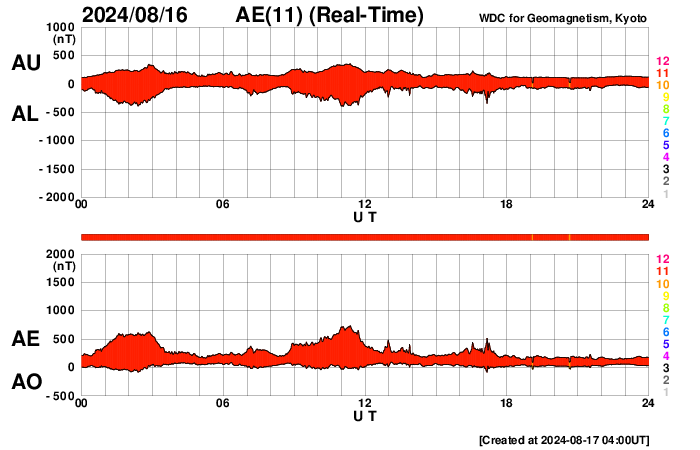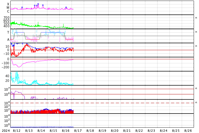 2024/ 8/17 13:20 更新 太陽風は低速の状態が続いています。磁気圏は穏やかです。 担当 篠原 太陽風の速度は、小幅ですが、350km/秒から330km/秒へ下がり、 より低速になっています。 磁場強度は、一時的に下がる変化がありますが、 全体としては6〜7nTで推移しています。 磁場の南北成分は、グラフの初めは南寄りでしたが、 その後、北寄りに傾向が変わっています。 このため、現在の磁気圏は穏やかで、 AE指数のグラフは、途中から変化が小さくなっています。 14日のCME(コロナ質量放出)による太陽風の乱れは まだ到来していません。 この後の太陽風の変化に注目して下さい。 太陽は、西の端(右端)に達した3780黒点群で M1.3の中規模フレア、 南東の端近く(左下)の3790群で C8.1、C8.9の小規模フレアなどが発生しています。 これらの領域は、特に活動的という様子ではありません。 ![]() SDO衛星のAIA193カメラによる太陽コロナの様子 (c) SDO (NASA) ![]() SDO衛星による太陽の可視光写真。マウスの矢印を写真に重ねると、黒点番号付きの写真に切り替わります。 (c) SDO (NASA) ![]() ACEが観測した太陽風の磁場(黒線は全体の強度、赤線は南北成分) 磁場の向き、プラズマの密度、速度、温度 (c) データ:NOAA/SWPC、作図:宇宙天気ニュース ![]() AE指数(速報値) 下段のAEグラフの値が高くなると、オーロラ活動が活発化しています。 (c) 京都大学WDC ![]() ![]() 27日の太陽周期に合わせた図 太陽が同じ面を地球に向けていた27日前の変化から、今後を予想することができます。 (c) 作図:宇宙天気ニュース