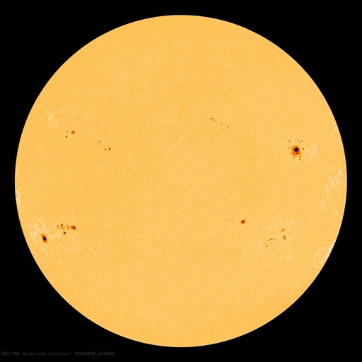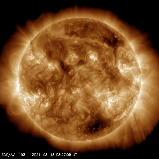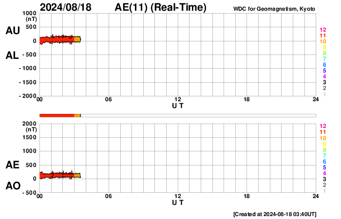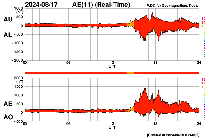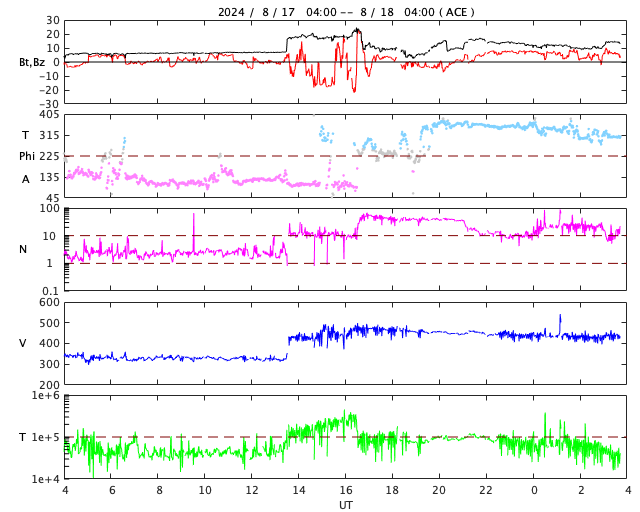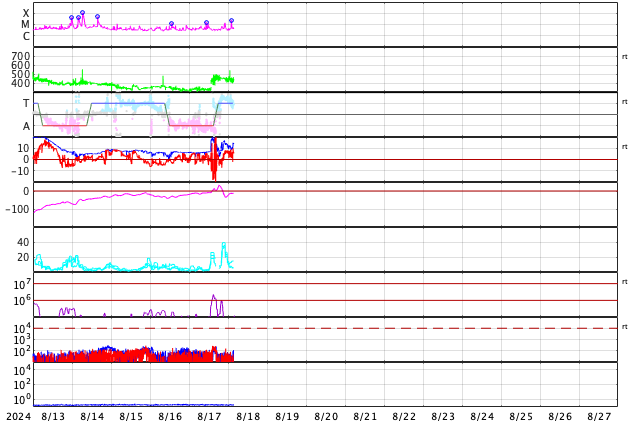 2024/ 8/18 12:54 更新 太陽風の乱れが到来し、磁気圏の活動が一時的に強まりました。 担当 篠原 14日のCME(コロナ質量放出)による太陽風の乱れは、 昨夜遅く、17日22時半(世界時17日13時半)に、 ACE衛星で観測されました。 CMEの発生から3日半ほどで変化がやって来ました。 太陽風の速度の高まりは比較的小さく、 320km/秒から、初めは430km/秒、その後470km/秒と、 低速の状態から平均的な速度に高まった程度です。 磁場強度は、7nTから18nTに強まり、 一時的に25nTに達する強まりも発生しましたが、 磁場の強まりはあまり続かず、 3時間ほどで10nTに下がっています。 磁場の南北成分は、南北に変化が見られ、 -15nTを超える強い南向きも発生しましたが、 長い時間は続いていません。 その後、磁場強度が下がると南北成分も小さくなり、 グラフの後半は、北寄りで推移する様になっています。 このため、磁気圏の活動は始めの頃に強まった程度で、 AE指数を見ると、 1000nTを超える大きい変化は3時間程度しか続かず、 以降は500nTと中規模の変化になり、 最後は小さい変化が見られる程度です。 現在の太陽風は、速度は430km/秒と平均的な状態で、 磁場強度は10〜15nTと強まりが続いていますが、 この後、次第に下がって行くでしょう。 太陽は、北西(右上)の3784黒点群で、M1.6、M2.4、 南西(右下)の3785群で、M1.1、 南東(左下)の3790群で、M1.1、M1.4と、 あちこちで中規模フレアが発生しています。 また、南東の端で、C6.6などの小規模フレアが 数回発生しています。 可視光写真で新しい黒点が現れていますが、 この後の活動はどうなるでしょうか。