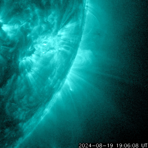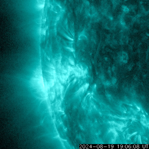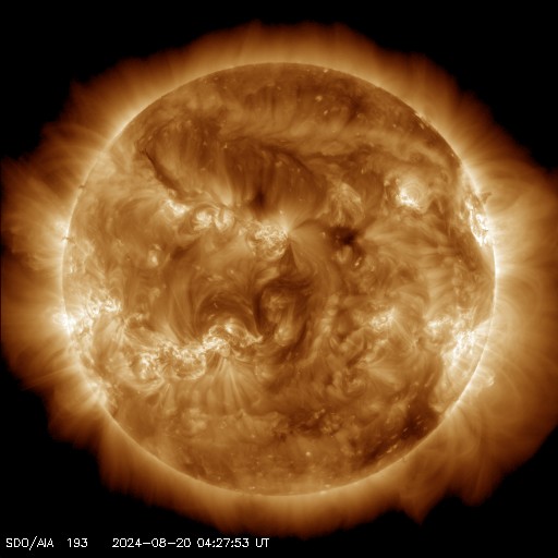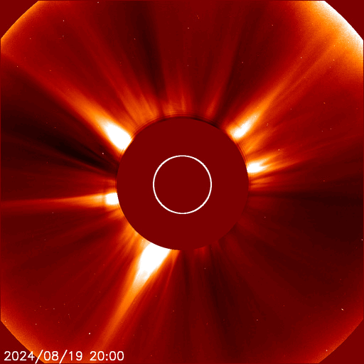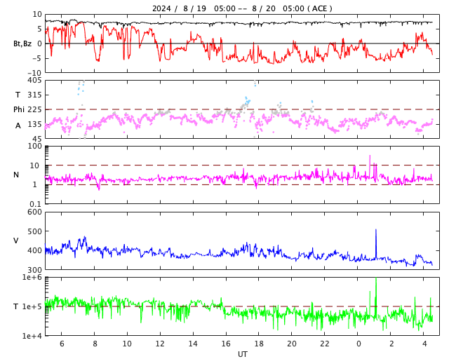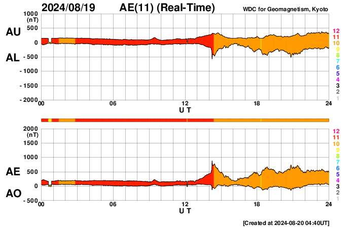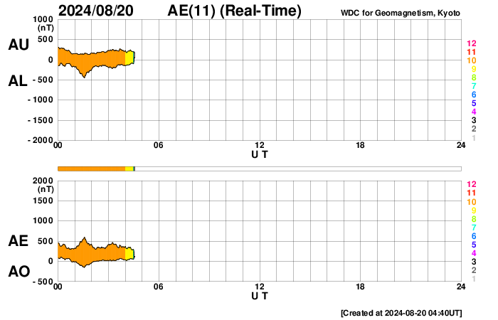 2024/ 8/20 13:49 更新 太陽風は低速になっています。ニュージーランドのオーロラをどうぞ。 担当 篠原 先週の話題ですが、8月12日に北海道などで 低緯度オーロラが観測されましたが、 南半球のオーロラの状況について、 ニュージーランド南島クィーンズタウンの米戸 実さんより 素晴らしい写真が届きましたので紹介します。 1枚目は、現地12日19時10分(世界時7時10分)の撮影で、 空はまだ薄明が少し残っていて、 写真の上の方には上弦の月が明るく写っています。 (月の左下にさそり座が見えています) 街から離れる前に撮影されたとのことで、 周囲がにぎやかな写真になっています。 太陽風磁場が北向きに切り替わったのを見て、 オーロラが静かになる前にと急いで撮影したとのことです。 磁気圏活動の強まりの前半の頃で、 AE指数は1500nT程度の変化が発生し、 Dst指数は-150nTくらいまで大きく下がった頃でした。 幸い、太陽風磁場は再び南向きになり、 2枚目を撮影した現地12日22時8分(世界時10時8分)の頃は、 AE指数は2000nTに達する激しい変化が起きていました。 米戸さんによると、写真では真っ赤ですが、 肉眼では白く見えるだけだそうです。 (写真の右上に南十字が横向きに見えています) そして、3枚目は、現地13日0時26分(世界時12日12時26分)。 12mmの広角レンズなので、 写真の上の方は天頂付近が写っているそうです。 まだ月が沈んでいませんが、 それでもこれだけ明るくオーロラが写っています。 (写真の中心の緑色のオーロラのすぐ上に南十字が見えています) 写真は続きがありますが、 ニュースの設定の関係で、続きは明日に紹介します。 素晴らしい写真をどうもありがとうございます。 ものすごい見え方です。 太陽風は、速度は400km/秒から350km/秒へ下がり、 低速になっています。 磁場強度は、7nTと少し強まった状態が安定して続いています。 磁場の南北成分は、グラフの中盤から南寄りになり、 -5nT前後の南向きが半日ほど続いています。 このため、磁気圏の活動はある程度強まり、 AE指数は500nTくらいの中規模の変化が半日ほど続いています。 太陽風のグラフの最後で、 磁場の南北成分は0nT付近になっています。 この状態が続くと、磁気圏の活動は静かになるでしょう。 太陽は、今朝、20日6時半(世界時19日21時半)に、 南東(左下)の3796黒点群で、 M3.7の中規模フレアが発生しました。 SDO衛星AIA131の動画を掲載します。 3796群は、昨日の朝のM1.3、M1.4に続く活動です。 この後も注目して下さい。 また、このフレアとほとんど同じ頃に、 西の端の向こう側(右端)でも ある程度規模の大きいフレアが発生した様で、 SDO衛星AIA131で、コロナが輝く様子が見えています。 このため、SOHO衛星LASCO C2、C3では、 太陽の右側にCME(コロナ質量放出)が飛び出しています。 左側にもCMEが見えていますが、 これがM3.7フレアによるものかは良く分かりません。