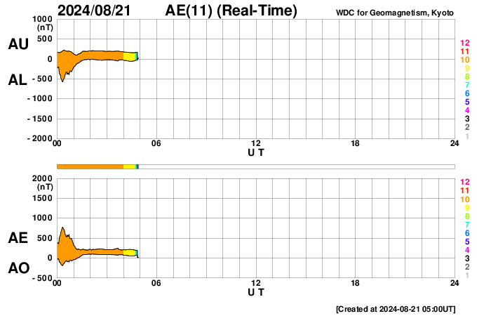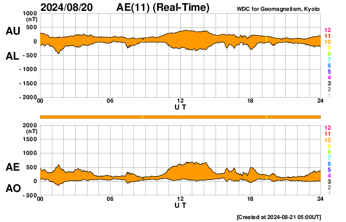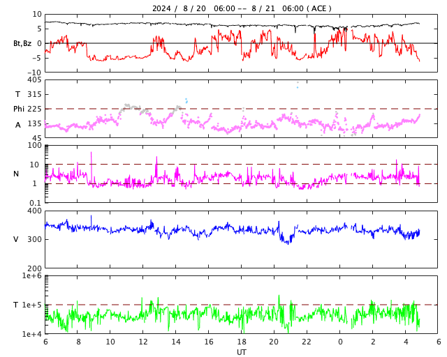 2024/ 8/21 14:04 更新 太陽風は低速ですが、磁気圏の活動はやや強まりました。ニュージーランドのオーロラの続きをどうぞ。 担当 篠原 昨日紹介した8月12〜13日の夜に撮影された ニュージーランドのオーロラ写真の続きです。 1枚目は、昨日の3枚目と同じ、 現地13日0時26分(世界時12日12時26分)の撮影です。 魚眼レンズなので、空全体の様子が良く分かります。 ぜひ2枚を並べて見て下さい。 2枚目は、3時間後の、 現地13日3時42分(世界時12日15時42分)。 月が沈んで空が暗くなったこともあり、 星空が写るくらいの露光になっています。 空全体が赤く見える様なオーロラの広がりになっています。 この頃、Dst指数は-200nT程度と 今回の磁気嵐の最大の変化になっていました。 そして、3枚目は、現地13日4時12分(世界時12日16時12分)と、 朝も近くなった頃です。 対角130度ある広角レンズによる天頂付近の撮影で、 オーロラの筋が放射状に写っています。 露光時間を長めにしているので、 2つのマゼラン雲など、星々がたくさん見えています。 撮影の時刻だけでも9時間にわたる記録です。 AE指数のグラフを見ると、 世界時でちょうど8月12日全体が活発に乱れたのですが、 その真ん中の一番良い時間帯を楽しまれた様に思います。 素晴らしい記録をどうもありがとうございました。 太陽風は、速度が350km/秒から320km/秒へ下がり、 より低速になっています。 磁場強度は、7nTから6nTに少し下がっている様です。 こちらは平均的な状態です。 磁場の南北成分は、 -5nTくらいの南向きの変化が頻繁に発生しています。 速度が下がっているので影響は限定的ですが、 AE指数は、500nT程度の中規模の変化が度々発生しています。 SDO衛星AIA193の太陽コロナ写真では、 コロナホールは特に見えていません。 太陽風は穏やかな状態が続きそうです。 太陽は、小さい変化ですが、 中心部北側(上側)の3793黒点群で、 21日1時半(世界時20日16時半)に C4.9の小規模フレアが発生しています。 SDO衛星AIA193の動画を見ると、 コロナが噴き上がる様子が見えています。 弱いCME(コロナ質量放出)が発生していて、 太陽風の小規模の乱れがやって来るかもしれません。 ![]() ニュージーランド南島クィーンズタウンで、現地13日0時26分(世界時12日12時26分)に撮影されたオーロラ。 (c) 米戸 実氏 ![]() ニュージーランド南島クィーンズタウンで、現地13日3時42分(世界時12日15時42分)に撮影されたオーロラ。 (c) 米戸 実氏 ![]() ニュージーランド南島クィーンズタウンで、現地13日4時12分(世界時12日16時12分)に撮影されたオーロラ。 (c) 米戸 実氏 ![]() 3793黒点群で発生した、C4.9の小規模フレア。 (c) SDO衛星AIA131 (NASA)、(動画加工 : 宇宙天気ニュース) ![]() SDO衛星のAIA193カメラによる太陽コロナの様子 (c) SDO (NASA) ![]() SDO衛星による太陽の可視光写真。マウスの矢印を写真に重ねると、黒点番号付きの写真に切り替わります。 (c) SDO (NASA) ![]() ACEが観測した太陽風の磁場(黒線は全体の強度、赤線は南北成分) 磁場の向き、プラズマの密度、速度、温度 (c) データ:NOAA/SWPC、作図:宇宙天気ニュース ![]() AE指数(速報値) 下段のAEグラフの値が高くなると、オーロラ活動が活発化しています。 (c) 京都大学WDC ![]() ![]() 27日の太陽周期に合わせた図 太陽が同じ面を地球に向けていた27日前の変化から、今後を予想することができます。 (c) 作図:宇宙天気ニュース