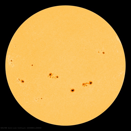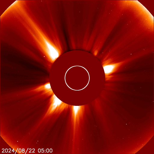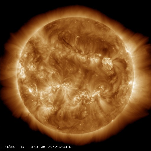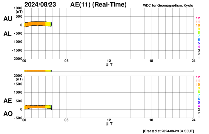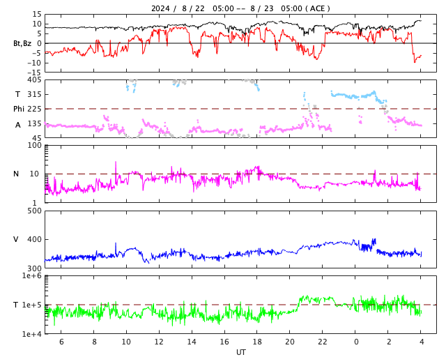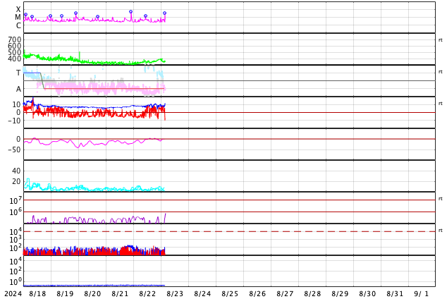 2024/ 8/23 13:19 更新 太陽風は低速で、磁気圏は穏やかです。フレアの発生が続いています。 担当 篠原 太陽風の速度は、 320km/秒から350km/秒へ少し上がっていますが、 低速の状態は続いています。 磁場強度は、グラフの途中から5〜10nTの間を 上がり下がりする様になっています。 磁場の南北成分は、北寄りに傾向が変わっています。 磁気圏は穏やかになっていて、 AE指数は小規模の変化が発生する程度です。 SDO衛星AIA193の太陽コロナ写真は、 全体がぼんやりと光っていて、 コロナホールは特に見えていません。 太陽風は穏やかな状態が続きそうです。 太陽は、中心部の3796黒点群で、 C5.0、C8.3、M1.5、C9.2など、 北東の端(左上)近くの3801群で、 C7.8、C6.1、M3.4など、 小規模、中規模のフレアが次々に発生しています。 この後も活動に注目して下さい。 また、太陽の向こう側ですが、 昨日の午後、22日15時(世界時22日6時)頃に フィラメント噴出などの現象が発生した様で、 SOHO衛星LASCO C2、C3で、 太陽の右上に広がるCME(コロナ質量放出)が観測されています。
