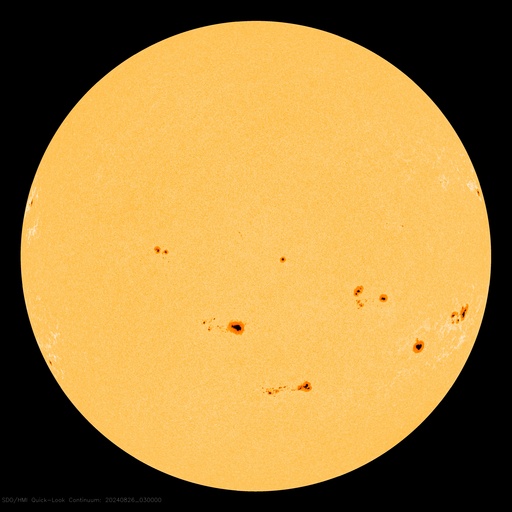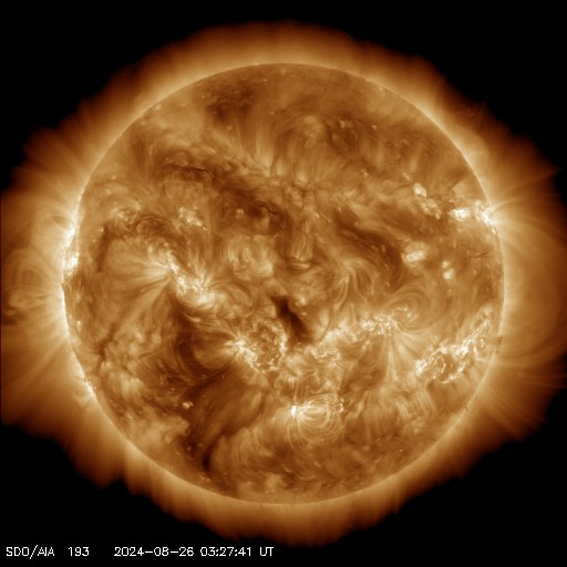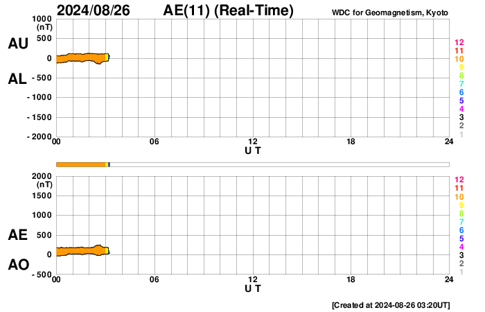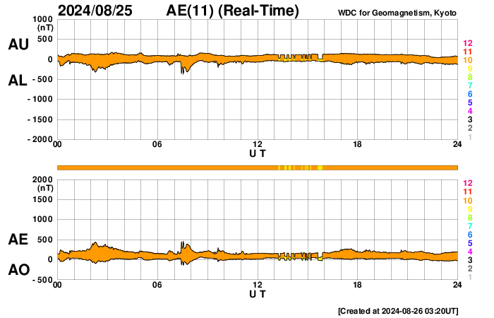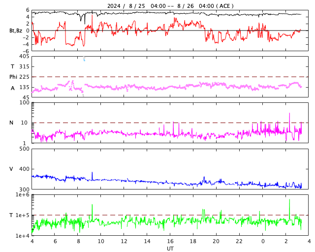 2024/ 8/26 12:37 更新 太陽風はより低速になっています。太陽のフレアは減っています。 担当 篠原 太陽風の速度は、370km/秒から310km/秒へ次第に下がり、 より低速になっています。 磁場強度は、5nTと平均的な状態で安定しています。 磁場の南北成分は、グラフの初めは南寄りで、 中盤は弱い北寄りになり、後半から再び南寄りになっています。 速度が下がっているため影響は小さく、 AE指数は小規模の変化が1回起きている程度で、 磁気圏は穏やかです。 SDO衛星AIA193では、コロナホールは特に見えていません。 太陽風は穏やかな状態が続きそうです。 昨日のニュース以降、太陽の活動はやや下がって、 Mクラスのフレアの発生はなく、 中心部南西側(右下)の3800黒点群で、C7.1、C5.8、 北西の端近く(右上)の3794群で、C4.6、C4.1、 などの小規模フレアが発生しています。 一方、東端(左端)の向こう側から 活動的な領域が近づいている様です。 どの様な領域が現れるでしょうか。 ![]() SDO衛星のAIA193カメラによる太陽コロナの様子 (c) SDO (NASA) ![]() SDO衛星による太陽の可視光写真。マウスの矢印を写真に重ねると、黒点番号付きの写真に切り替わります。 (c) SDO (NASA) ![]() ACEが観測した太陽風の磁場(黒線は全体の強度、赤線は南北成分) 磁場の向き、プラズマの密度、速度、温度 (c) データ:NOAA/SWPC、作図:宇宙天気ニュース ![]() AE指数(速報値) 下段のAEグラフの値が高くなると、オーロラ活動が活発化しています。 (c) 京都大学WDC ![]() ![]() 27日の太陽周期に合わせた図 太陽が同じ面を地球に向けていた27日前の変化から、今後を予想することができます。 (c) 作図:宇宙天気ニュース
