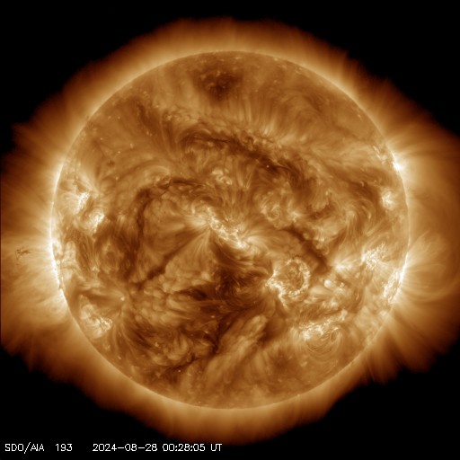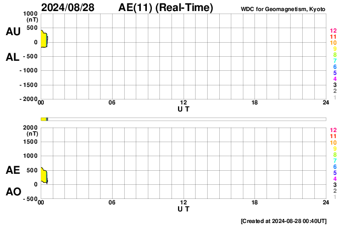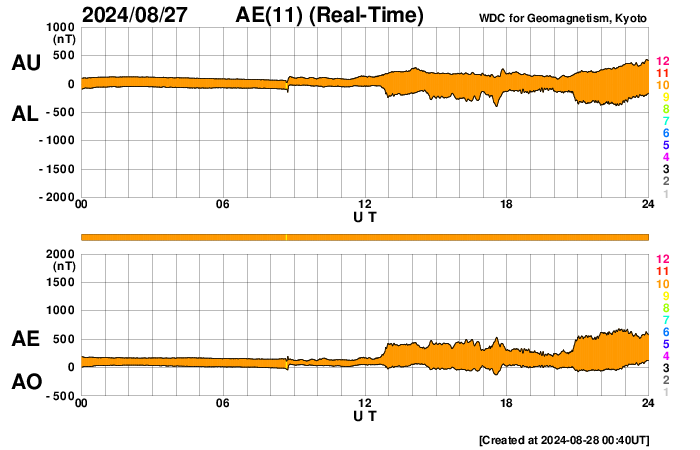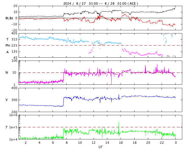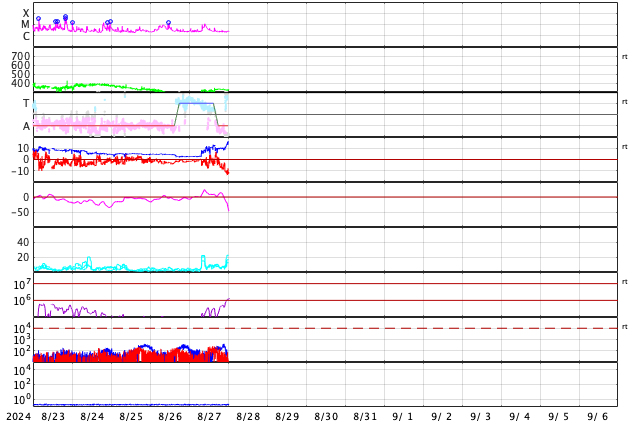 2024/ 8/28 09:51 更新 太陽風の乱れが到来して、磁場が南向きに強まっています。 担当 篠原 昨夕、27日16時半(世界時27日7時半)に、 太陽風の小規模の急な強まりがACE衛星で観測されました。 速度は、250km/秒から320km/秒へ少し高まった程度で、 低速の状態は続き、 磁場強度は3nTから7nTと、少し強まった程度です。 速度は、その後も320〜330km/秒で推移していますが、 磁場強度は10nTに強まり、 今朝になると15nTに達しています。 磁場の南北成分は、 乱れの到来後は弱い南寄りで推移していましたが、 今朝早くから南向きにより強まっていて、 現在は、-10nTを超えるくらいに達しています。 太陽風の速度が下がっているため、 磁気圏への影響は限定的で、 AE指数は、ここまでは500nTに達するくらいの 中規模の変化に留まっています。 しかし、現在は磁場が南向きに強まっているので、 この後の磁気圏の活動はもう一段強まる可能性があります。 太陽風磁場や磁気圏活動の推移に注目して下さい。 太陽は、南西(右下)の3800黒点群で、 C9.9の小規模フレア、 南西の端に近付いている3796群で、 M1.1の中規模フレアが発生していますが、 全体としては、活動は静かになっています。 東側(左側)の黒点群では、特に活動は起きていません。 今夜から台風の影響が強まる見通しのため、 この後、学内LANが停止することになっています。 このため、宇宙天気ニュースを外部に一時避難します。 この間は、グラフなどの最新データやフレア速報は停止します。 台風の速度が遅いため、来週までこの状態が続く可能性があります。 記事の更新は、可能な範囲で行います。