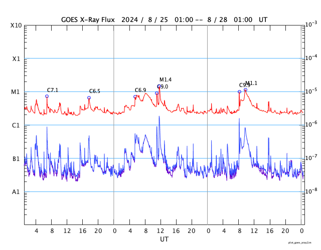 GOES衛星の太陽X線強度。赤・橙 = 0.1〜0.8 nm、青・紫 = 0.05〜0.4 nm (c) データ:NOAA/SWPC、作図:宇宙天気ニュース ![]() | ||||||||||||||||||||||||||||||||||||||||||||||||||||||||||||||||||||||||||||||||||||||||||||||||||||||||||||||||||||||||||||||||||||||||||||||||||||||||||||||||||||||||||||||||||||||||||||||||||||||||||||||||||||||||||||||||||||||||||||||||||||||||||||||||||||||||||||||||||||||||||||||||||||