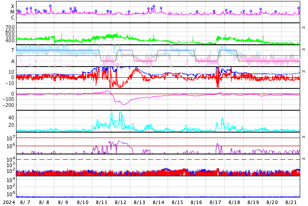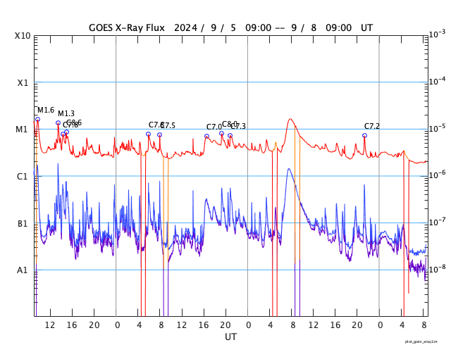 GOES衛星の太陽X線強度。赤・橙 = 0.1〜0.8 nm、青・紫 = 0.05〜0.4 nm (c) データ:NOAA/SWPC、作図:宇宙天気ニュース ![]() | ||||||||||||||||||||||||||||||||||||||||||||||||||||||||||||||||||||||||||||||||||||||||||||||||||||||||||||||||||||||||||||||||||||||||||||||||||||||||||||||||||||||||||||||||||||||||||||||||||||||||||||||||||||||||||||||||||||||||||||||||||||||||||||||||||||||||||||||||||||||||||||||||||||||||||||||||||||||||||||||||||||||||||||||
