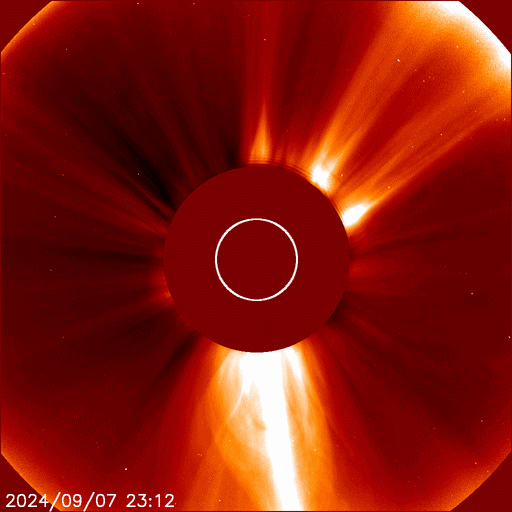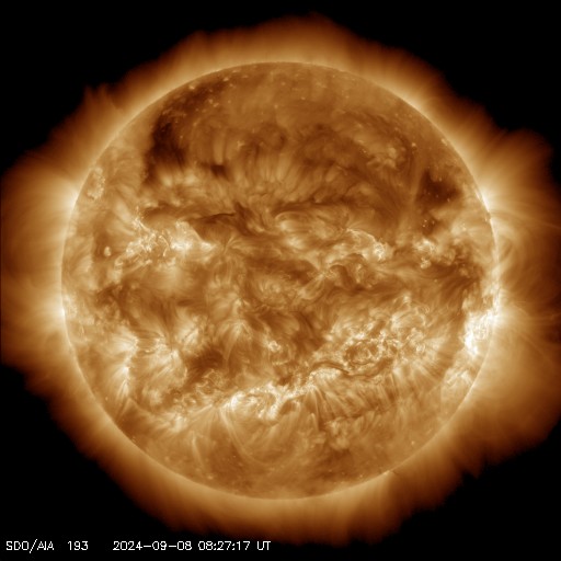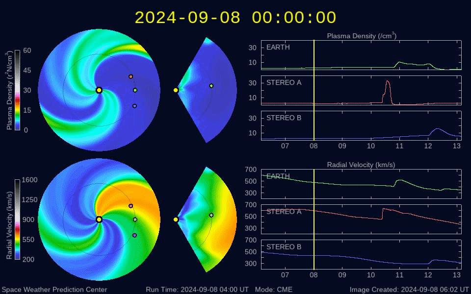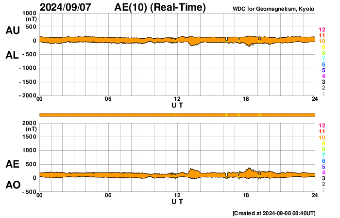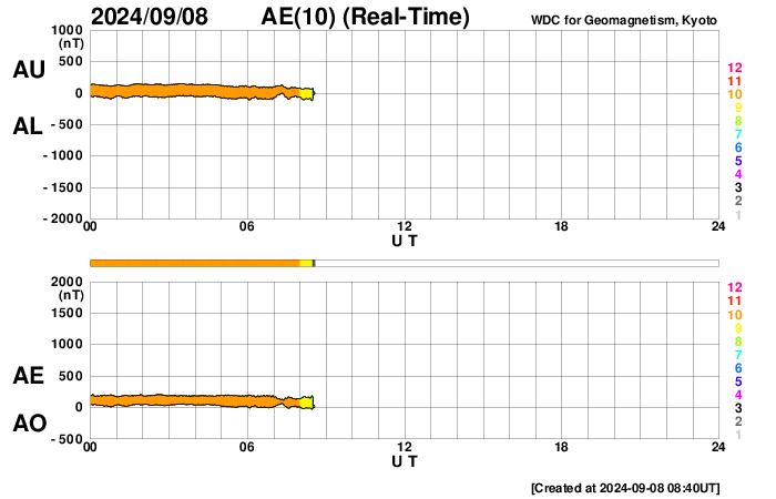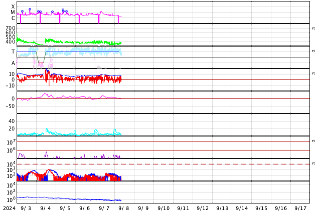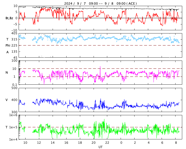 2024/ 9/ 8 17:50 更新 太陽風は低速の状態です。CMEが発生して、影響が地球へ到来する可能性があります。 担当 篠原 太陽風は、速度が380km/秒から350km/秒へ下がり、 より低速になっています。 グラフの最後で380km/秒に上がる変化が見えていますが、 この後はどの様に推移するでしょうか。 磁場強度は、昨日のニュースの後に10nTへ強まり、 その後低下して、現在は7nTと平均的な状態に戻っています。 磁場の南北成分は、北寄りの傾向から、 南北に変化する状態に変わっています。 しかし、速度が下がっていることもあり、 AE指数の変化は特に見られず、 磁気圏は穏やかに推移しています。 SDO衛星AIA193では、コロナホールは特に見えていません。 この後も太陽風は穏やかな状態が続きそうです。 太陽は、今朝、8日9時(世界時0時)に、 中心部の北西側(右上)でフィラメント噴出が発生しています。 SDO衛星AIA304の動画を掲載します。 この噴出により、CME(コロナ質量放出)が 太陽の右上寄りに広がっています。 NOAA/SWPCの太陽風予報によると、 このCMEによる太陽風の乱れが、 3日後の11日5時(世界時10日20時)頃に 地球に到来する可能性があるとのことです。 速度の変化は小さいと思いますが、 磁場の強まりがやって来て、南向きに強まると、 磁気圏の活動は活発になります。 少し先ですが、注目してください。 今日の昼に成田に着きました。 これから鹿児島に向かうところです。 派手なオーロラを見ることはできませんでしたが、 オーロラ観望初心者としてはいろいろと勉強になる旅でした。 また行きたくなりますね・・・
