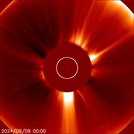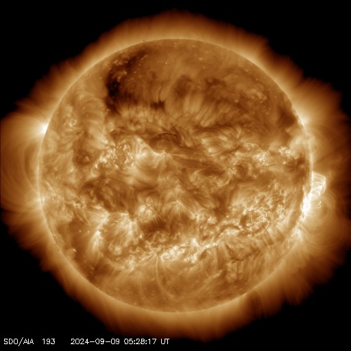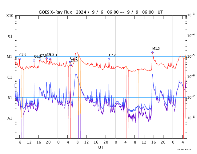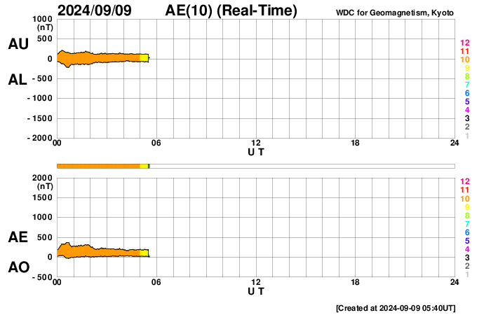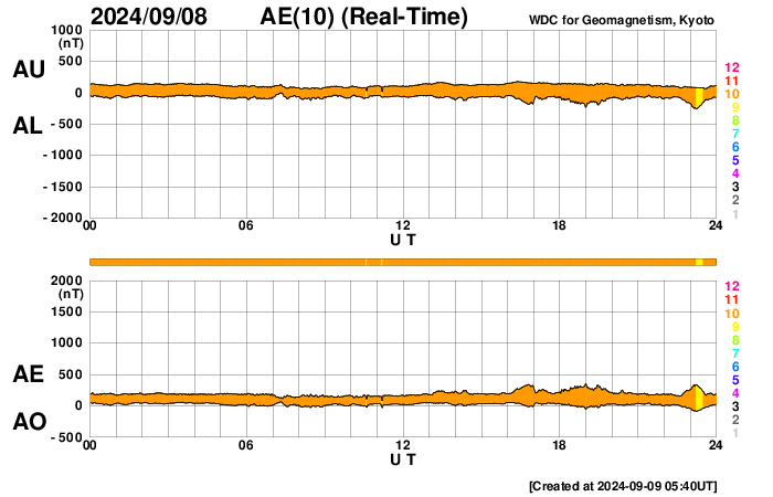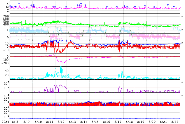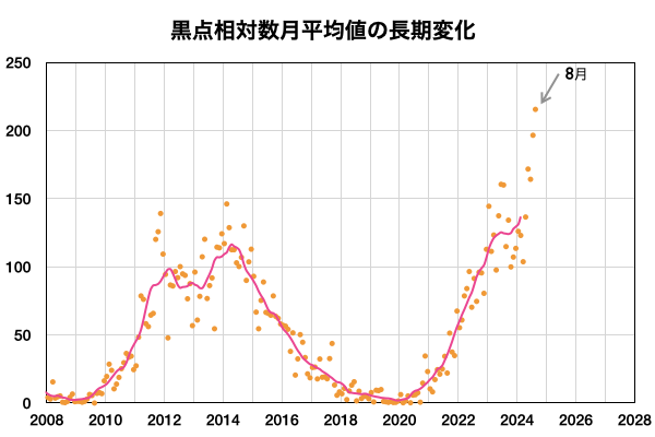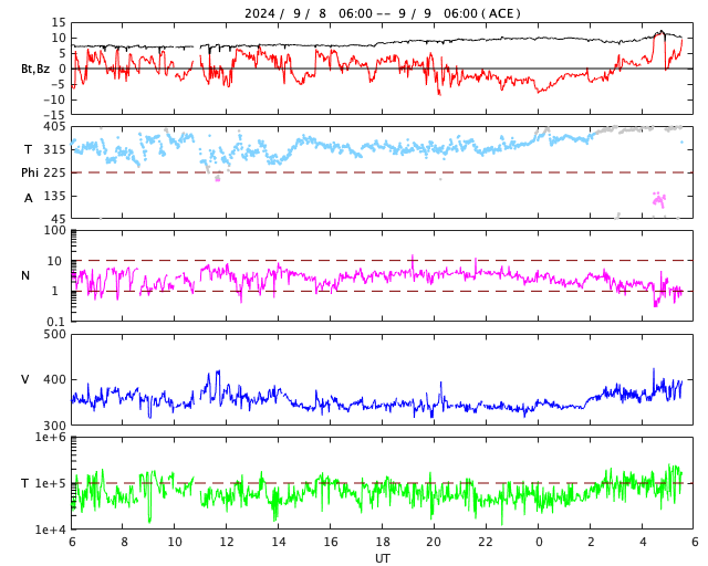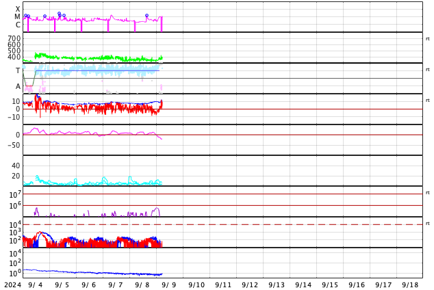 2024/ 9/ 9 14:47 更新 太陽風は低速で、磁気圏も概ね静穏です。8月の黒点相対数は 215.5 でした。 担当 篠原 WDC-SILSOより、8月の黒点相対数は 215.5 と発表されました。 7月の 196.5 をさらに上回り、 現在の第25期の最高値を更新しました。 とうとう200を超えたので、 1枚目の図は縦軸を250まで伸ばしています。 (ついでに横軸も2028年まで広げています) 月平均値がこの値に達したのは、 2001年9月の 238.2 以来で、23年ぶりです。 また、第23期全体で見ても 215.5 以上の月は、 他に2000年3月の 217.7 と 2000年7月の 244.3 と、 計3回だけです。 可視光写真の動画を見ると、 黒点の多い状態がずっと続いています。 1日値で調べると、200以上の日は22日と71%に達しています。 7月の場合は、13日、42%と一段低い割合に留まっていました。 黒点相対数の高まりは今後どの様に推移するでしょうか。 引き続き注目してください。 太陽では、9日11時(世界時9日2時)頃に、 西の端(右端)でM1.0の中規模フレアが発生しました。 SDO衛星AIA131の動画を掲載します。 また、CME(コロナ質量放出)が太陽の右側に飛び出しています。 横向きなので、地球への影響はないでしょう。 太陽風は、速度は350km/秒で推移して、 グラフの最後で380km/秒に少し上がっています。 磁場強度は、7nTから10nTに上がって、 少し強まっています。 磁場の南北成分は、南を向いたり、北を向いたり、 時間とともに変化していますが、 速度が下がってるため、磁気圏への影響は小さく、 AE指数は、磁場が南寄りになった時間帯に 小規模の変化が発生している程度です。 SDO衛星AIA193では、 太陽の北東側(左上)にコロナホールが見えています。 緯度が高いので、地球への影響は小さそうです。