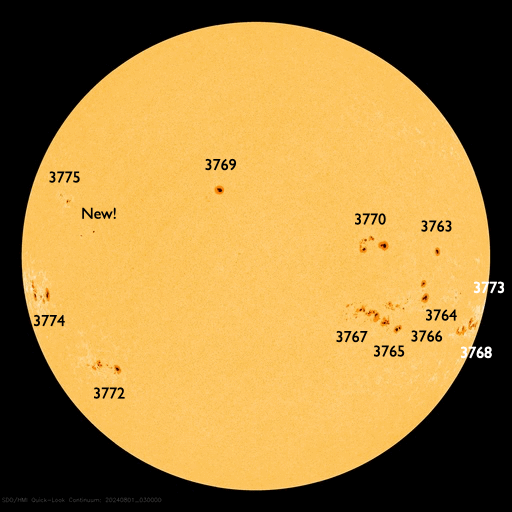 (c) 黒点データ:WDC-SILSO、作図:宇宙天気ニュース ![]() 1975年以降の太陽黒点相対数の長期変化。 (c) 黒点データ:WDC-SILSO、作図:宇宙天気ニュース ![]() 8月の太陽黒点の推移。SDO衛星。 (c) SDO衛星AIA193 (NASA)、作図:宇宙天気ニュース ![]() 太陽の西の端で発生したM1.0の中規模フレア。 (c) SDO衛星AIA131 (NASA)、(動画加工 : 宇宙天気ニュース) ![]() 太陽の右側へ飛び出すCME。 (c) SOHO衛星LASCO C2、C3 (ESA & NASA)、(動画加工 : 宇宙天気ニュース) ![]() SDO衛星のAIA193カメラによる太陽コロナの様子 (c) SDO (NASA) ![]() SDO衛星による太陽の可視光写真。マウスの矢印を写真に重ねると、黒点番号付きの写真に切り替わります。 (c) SDO (NASA) ![]() GOES衛星の太陽X線強度。赤・橙 = 0.1〜0.8 nm、青・紫 = 0.05〜0.4 nm (c) データ:NOAA/SWPC、作図:宇宙天気ニュース ![]() ACEが観測した太陽風の磁場(黒線は全体の強度、赤線は南北成分) 磁場の向き、プラズマの密度、速度、温度 (c) データ:NOAA/SWPC、作図:宇宙天気ニュース ![]() AE指数(速報値) 下段のAEグラフの値が高くなると、オーロラ活動が活発化しています。 (c) 京都大学WDC ![]() ![]() 27日の太陽周期に合わせた図 太陽が同じ面を地球に向けていた27日前の変化から、今後を予想することができます。 (c) 作図:宇宙天気ニュース