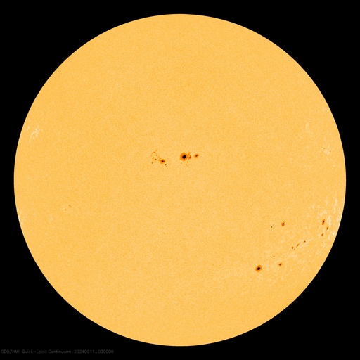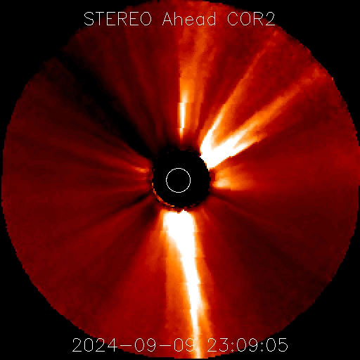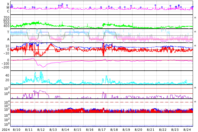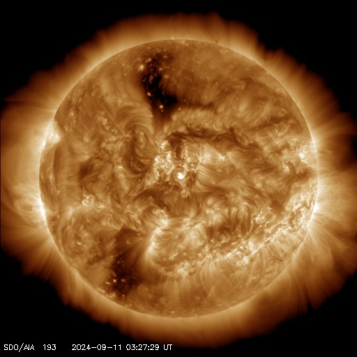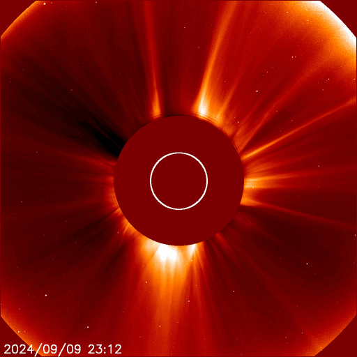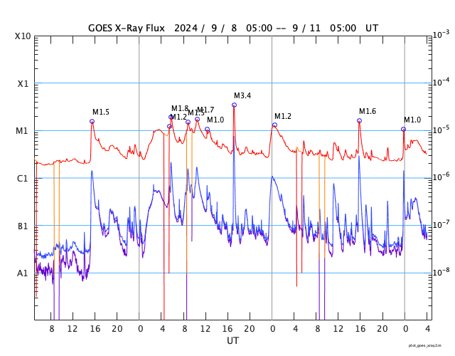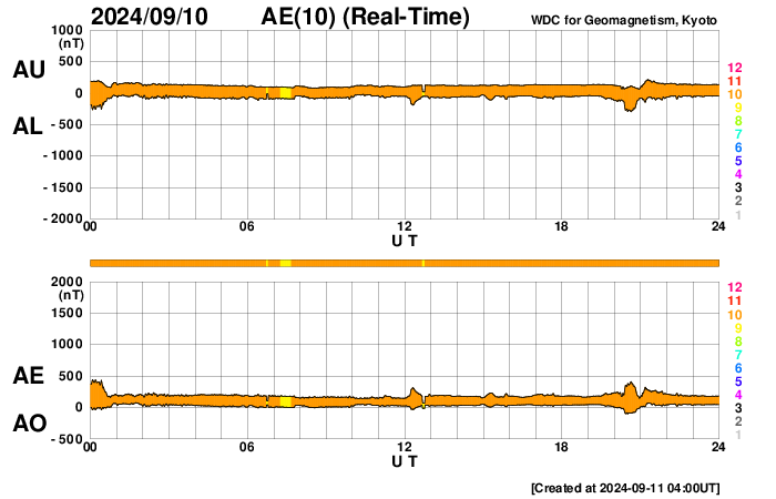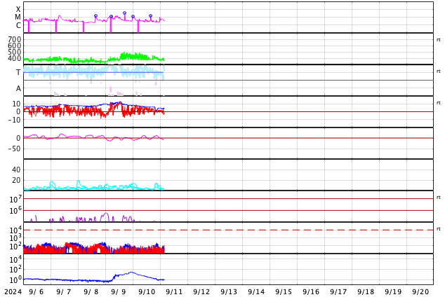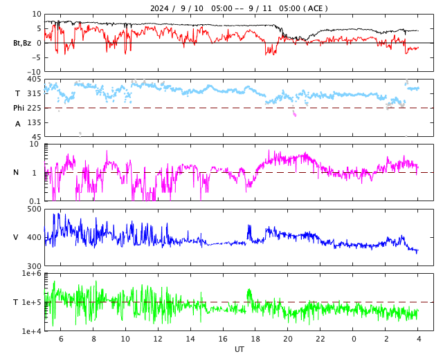 2024/ 9/11 13:19 更新 太陽風は低速になり、磁気圏は穏やかです。 担当 篠原 昨日のニュースでお知らせした、 10日9時(世界時10日0時)のM1.2中規模フレアに伴って発生した CME(コロナ質量放出)の動画を掲載します。 SOHO衛星の青い画像、LASCO C3に注目すると、 CMEは太陽の左上寄りに濃く広がっていますが、 右側や下側にも淡く飛び出しています。 この広がりは、2枚目のSTEREO Ahead衛星COR2の 動画でも見ることができます。 このため、CMEによる太陽風の乱れは 地球に到来する可能性がある様です。 到来まで3日程度と考えると、明後日、13日の午前中でしょうか。 注目して下さい。 太陽のフレアの発生はやや落ち着いた印象で、 今朝、11日8時半(世界時10日23時半)に、 中心部北側の3814黒点群で M1.0の中規模フレアが発生した程度です。 太陽風は、速度が400km/秒から350km/秒に下がり、 低速になっています。 磁場強度は、8nTから5nTに下がり平均的な状態です。 磁場の南北成分は、グラフの前半は北寄りで、 後半は0nT付近で小さく変化しています。 磁気圏は穏やかで、AE指数はほとんど変化のない状態です。 SDO衛星AIA193の太陽コロナ写真では、 北半球と南半球それぞれの高緯度寄りに コロナホールが見えている様です。 緯度が高めですが、4日後くらいから影響がやって来るでしょうか。 ![]() 10日9時(世界時10日0時)のM1.2中規模フレアに伴って発生したCME。 (c) SOHO衛星LASCO C2、C3 (ESA & NASA)、(動画加工 : 宇宙天気ニュース) ![]() 10日9時(世界時10日0時)のM1.2中規模フレアに伴って発生したCME。 (c) STEREO Ahead衛星COR2 (NASA)、(動画加工 : 宇宙天気ニュース) ![]() SDO衛星のAIA193カメラによる太陽コロナの様子 (c) SDO (NASA) ![]() SDO衛星による太陽の可視光写真。マウスの矢印を写真に重ねると、黒点番号付きの写真に切り替わります。 (c) SDO (NASA) ![]() GOES衛星の太陽X線強度。赤・橙 = 0.1〜0.8 nm、青・紫 = 0.05〜0.4 nm (c) データ:NOAA/SWPC、作図:宇宙天気ニュース ![]() ACEが観測した太陽風の磁場(黒線は全体の強度、赤線は南北成分) 磁場の向き、プラズマの密度、速度、温度 (c) データ:NOAA/SWPC、作図:宇宙天気ニュース ![]() AE指数(速報値) 下段のAEグラフの値が高くなると、オーロラ活動が活発化しています。 (c) 京都大学WDC ![]() ![]() 27日の太陽周期に合わせた図 太陽が同じ面を地球に向けていた27日前の変化から、今後を予想することができます。 (c) 作図:宇宙天気ニュース