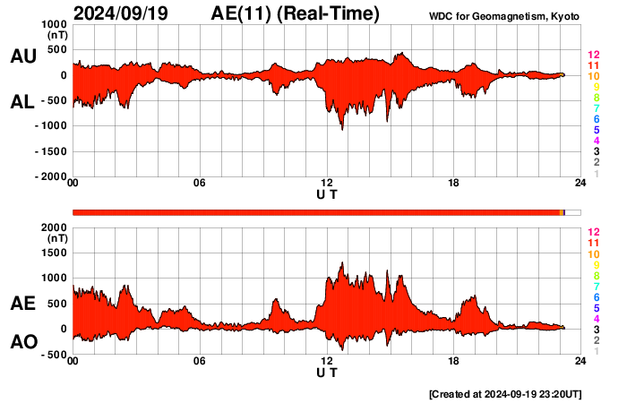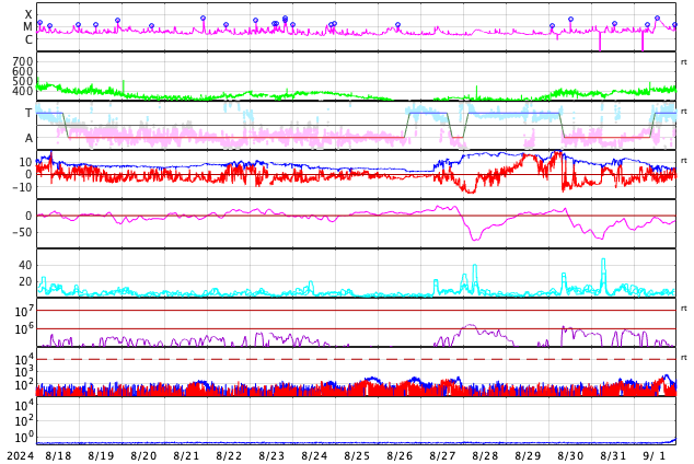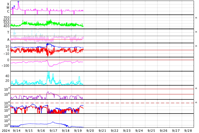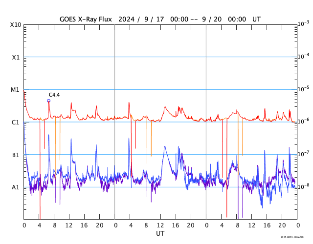 GOES衛星の太陽X線強度。赤・橙 = 0.1〜0.8 nm、青・紫 = 0.05〜0.4 nm (c) データ:NOAA/SWPC、作図:宇宙天気ニュース ![]() | ||||||||||||||||||||||||||||||||||||||||||||||||||||||||||||||||||||||||||||||||||||||||||||||||||||||||||||||||||||||||||||||||||||||||||||||||||||||||||||||||||||||||||||||||||||||||||||||||||||||||||||||||||||||||||||||||||||||||||||||
