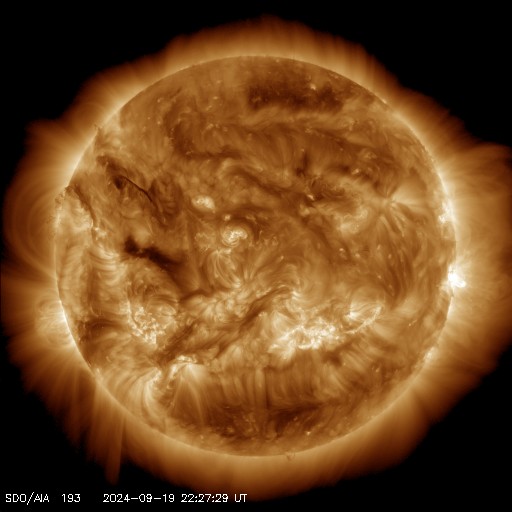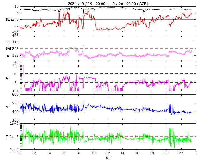 2024/ 9/20 08:35 更新 太陽風磁場の南向きの変化により、磁気圏の活動が活発になっています。 担当 篠原 太陽風の速度は、 450km/秒から400km/秒へゆっくり下がっています。 この後さらに下がって、低速の状態になるかもしれません。 磁場強度は、7〜8nTの状態が続いています。 磁場の南北成分は、南北にゆっくり変化する傾向が続いていて、 -5nTを超えるくらいの強めの南向きが発生しています。 その時間帯に磁気圏の活動が強まって、 AE指数は、1000nTを超える大きい変化が発生しています。 この後、太陽風の速度が低下した場合は、 磁気圏活動の変化は小さくなるでしょう。 SDO衛星AIA193の太陽コロナ写真では、 コロナホールは特に見えていません。 太陽風は穏やかな状態が続きそうです。 太陽は、C2台の小さいフレアが数回発生した程度で、 穏やかな状態です。 南東の端(左下)に新しい黒点が現れていますが、 フレアは特に発生していません。 ![]() SDO衛星のAIA193カメラによる太陽コロナの様子 (c) SDO (NASA) ![]() SDO衛星による太陽の可視光写真。マウスの矢印を写真に重ねると、黒点番号付きの写真に切り替わります。 (c) SDO (NASA) ![]() ACEが観測した太陽風の磁場(黒線は全体の強度、赤線は南北成分) 磁場の向き、プラズマの密度、速度、温度 (c) データ:NOAA/SWPC、作図:宇宙天気ニュース ![]() AE指数(速報値) 下段のAEグラフの値が高くなると、オーロラ活動が活発化しています。 (c) 京都大学WDC ![]() 27日の太陽周期に合わせた図 太陽が同じ面を地球に向けていた27日前の変化から、今後を予想することができます。 (c) 作図:宇宙天気ニュース