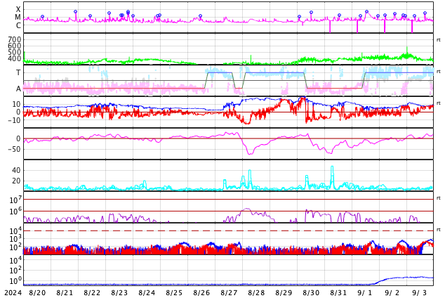 GOES衛星の太陽X線強度。赤・橙 = 0.1〜0.8 nm、青・紫 = 0.05〜0.4 nm (c) データ:NOAA/SWPC、作図:宇宙天気ニュース ![]() | ||||||||||||||||||||||||||||||||||||||||||||||||||||||||||||||||||||||||||||||||||||||||||||||||||||||||||||||||||||||||||||||||||||||||||||||||||||||||||||||||||||||||||||||||||||||||||||||||||||||||||||||||||||||||||||||||||||||||||||||