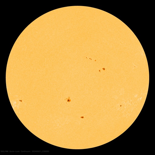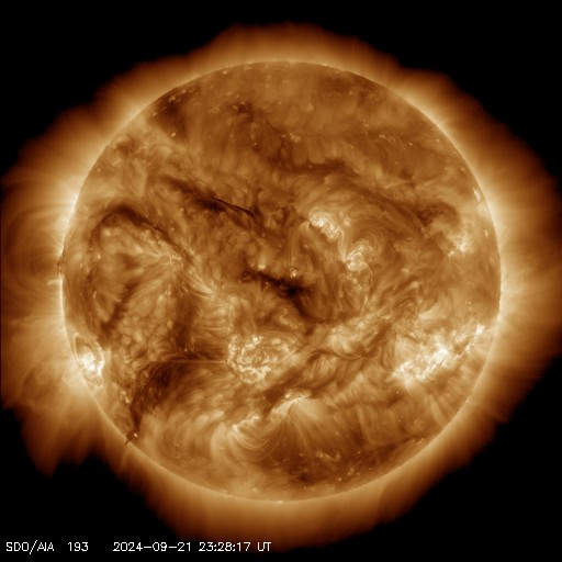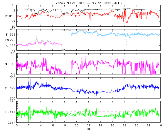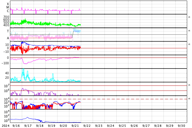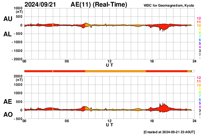 2024/ 9/22 08:53 更新 太陽風は平均的な状態で、磁気圏は穏やかです。カナダ・イエローナイフのオーロラをどうぞ。 担当 篠原 カナダ・イエローナイフに滞在中の景山植光さんより、 現地21日1時半(世界時21日7時半)頃に撮影された オーロラの写真をいただきました。 AE指数を見ると、この夜もとても穏やかで、 世界時21日8時に200nTの小さい変化が発生している程度です。 景山さんの撮影はこの活動の立ち上がりの頃です。 オーロラツアーの関係で、戻り始める頃の出現だったとのことで、 撮影に苦労されたとのことです。 今回も速報をありがとうございます。 グラフだけでは分からない現地の様子が分かり、 とても参考になります。 太陽風は、400km/秒前後と平均的な速度で安定しています。 磁場強度も6nTと平均的な状態です。 磁場の南北成分は、0nT付近で南北に小さく変化しています。 磁気圏は穏やかな状態ですが、 AE指数を見ると、磁場が南寄りになった頃に、 小規模の変化が発生しています。 SDO衛星AIA193では、コロナホールは特に見えていません。 太陽風は穏やかに推移しそうです。 太陽も穏やかな状態が続いています。 3831黒点群でC4.4の小規模フレアが発生した程度です。
