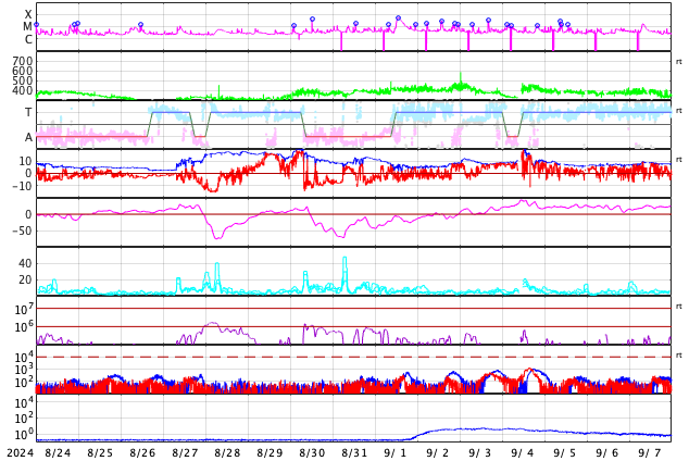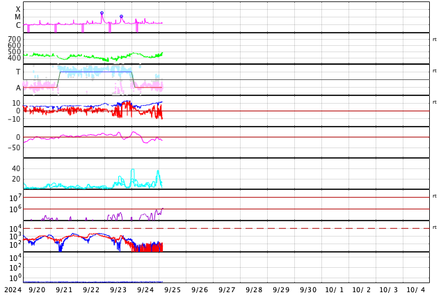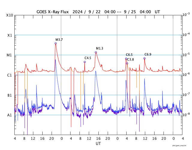 GOES衛星の太陽X線強度。赤・橙 = 0.1〜0.8 nm、青・紫 = 0.05〜0.4 nm (c) データ:NOAA/SWPC、作図:宇宙天気ニュース ![]() | ||||||||||||||||||||||||||||||||||||||||||||||||||||||||||||||||||||||||||||||||||||||||||||||||||||||||||||||||||||||||||||||||||||||||||||||||||||||||||||||||||||||||||||||||||||||||||||||||||||||||||||||||||||||||||||||||||||||||||||||||||||||||||||||||||