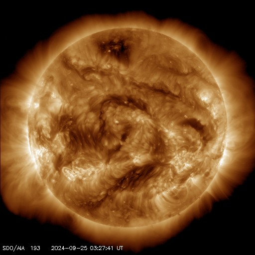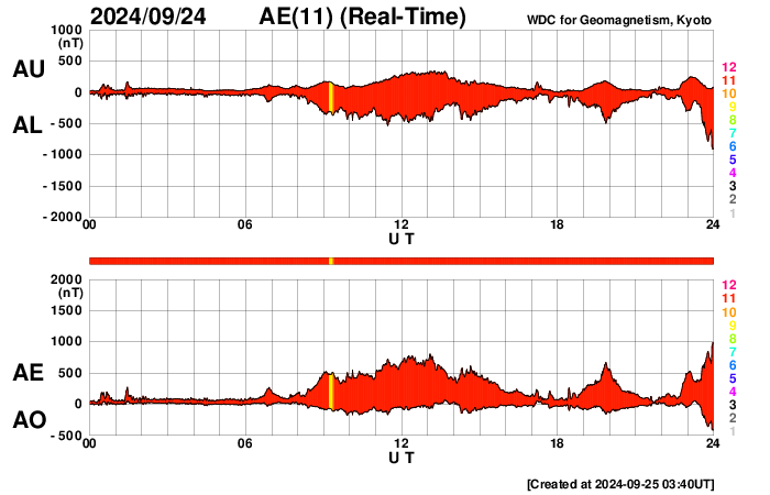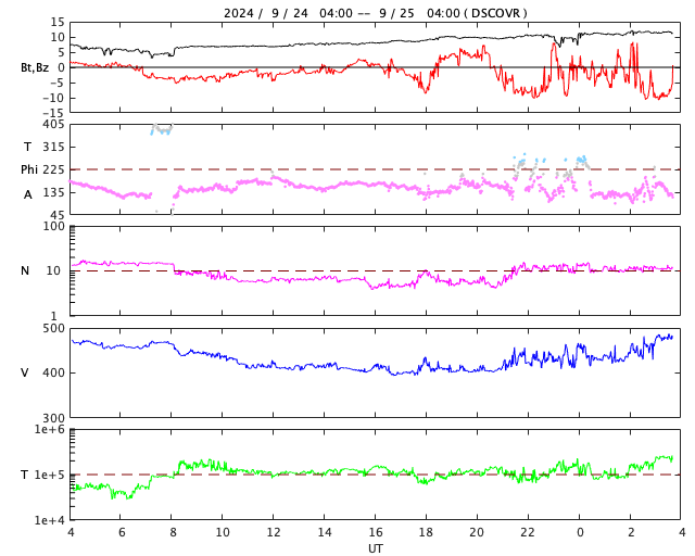 2024/ 9/25 12:52 更新 太陽風磁場が南向きに強まり、磁気圏の活動が強まっています。 担当 篠原 太陽風の磁場が強まっています。 昨日の5nTという状態から、少しずつ上昇が続き、 現在は12nTまで強まっています。 太陽風の速度は、470km/秒から一旦400km/秒へ下がり、 グラフの最後で470km/秒に再び高まっています。 磁場の南北成分は、 グラフの前半は弱い南向きの傾向が続き、 その後、今日未明くらいから南北に大きく変化するようになり、 -10nTくらいの強い南向きが発生しています。 このため磁気圏の活動が強まっていて、 初めは500〜700nTくらいの中規模の変化でしたが、 後半は1000nTに達する大きい変化が発生しています。 現在の太陽風磁場が南向きに強まっていることから、 この後も大きい変化が発生しそうです。 太陽は、比較的穏やかな状態が続いています。 南東(左下)の3635黒点群でC6.5、 中心部南西側(右下)の3628群でC6.9の 小規模フレアが発生しています。 ![]() SDO衛星のAIA193カメラによる太陽コロナの様子 (c) SDO (NASA) ![]() SDO衛星による太陽の可視光写真。マウスの矢印を写真に重ねると、黒点番号付きの写真に切り替わります。 (c) SDO (NASA) ![]() DSCOVRが観測した太陽風の磁場(黒線は全体の強度、赤線は南北成分) 磁場の向き、プラズマの密度、速度、温度 (c) データ:NOAA/SWPC、作図:宇宙天気ニュース ![]() AE指数(速報値) 下段のAEグラフの値が高くなると、オーロラ活動が活発化しています。 (c) 京都大学WDC ![]() ![]() 27日の太陽周期に合わせた図 太陽が同じ面を地球に向けていた27日前の変化から、今後を予想することができます。 (c) 作図:宇宙天気ニュース