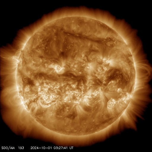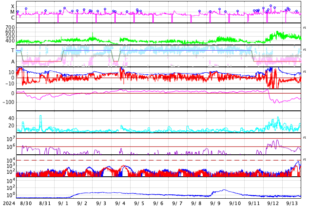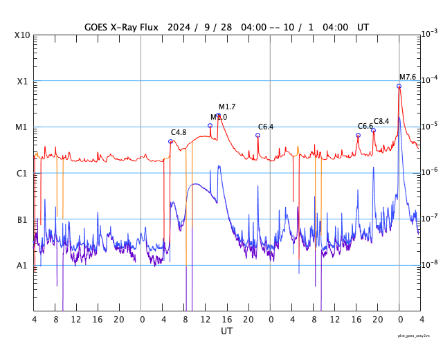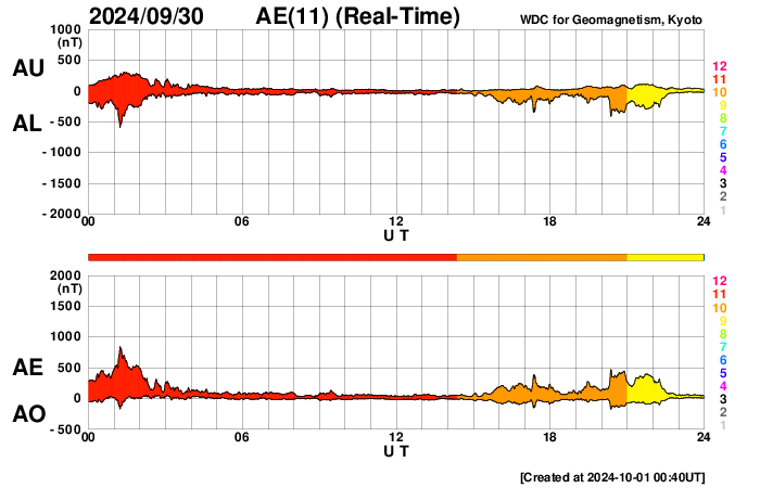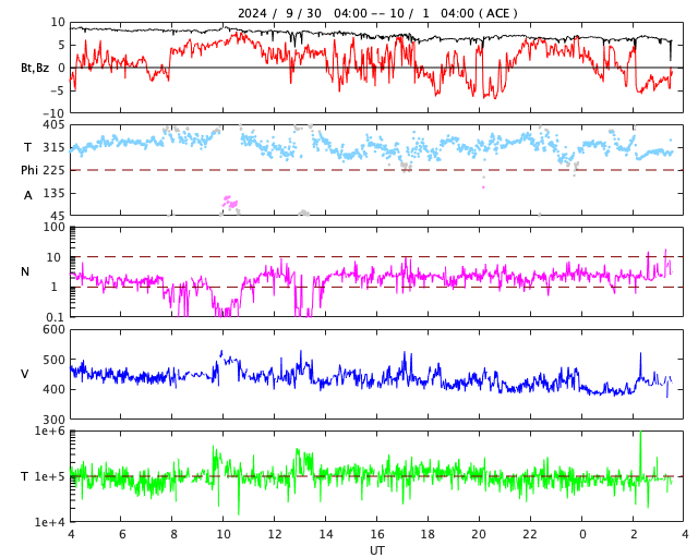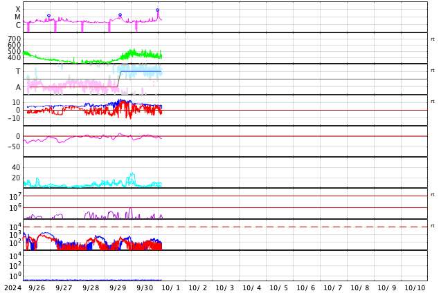 2024/10/ 1 12:46 更新 M7.6の中規模フレアが発生しました。太陽風は平均的な速度に戻っています。 担当 篠原 今朝、1日8時半(世界時9月30日23時半)に、 太陽の南東(左下)の3842黒点群で、 M7.6の中規模フレアが発生しました。 SDO衛星AIA131の動画を掲載します。 発生場所が太陽の中心にやや近いので、 CME(コロナ質量放出)が発生していれば、 太陽風の乱れは地球へやって来る可能性があります。 今後の情報に注目して下さい。 3842群では、29日深夜のM1.7に続くMクラスフレアです。 この後の活動はどうなるでしょうか。 太陽では、30日19時(世界時30日10時)頃に中心部の北側(上側)で、 直後の30日22時(世界時30日13時頃)に南東側で、 フィラメント噴出が発生しています。 SDO衛星AIA304の童画を掲載します。 SOHO衛星によると、淡いCMEが飛び出している様です。 この影響で、太陽風磁場の強まりが 地球へやって来るかもしれません。 太陽風は、速度が450km/秒から400km/秒へ下がり、 平均的な速さに戻っています。 磁場強度も8nTから6nTへ下がっています。 太陽風速度の高まりは、1日程度で終わっています。 太陽風磁場の南北成分は、 昨日のニュース以降は北寄りの傾向になっています。 このため磁気圏は穏やかに推移していて、 AE指数は、磁場が一時的に南向きになった頃に 400nTの小規模の変化が発生した程度です。 ![]() 3842黒点群で発生した、M7.6の中規模フレア。 (c) SDO衛星AIA131 (NASA)、(動画加工 : 宇宙天気ニュース) ![]() 太陽の中心部北側と、南東側で発生したフィラメント噴出。 (c) SDO衛星AIA304、(動画加工 : 宇宙天気ニュース) ![]() SDO衛星のAIA193カメラによる太陽コロナの様子 (c) SDO (NASA) ![]() SDO衛星による太陽の可視光写真。マウスの矢印を写真に重ねると、黒点番号付きの写真に切り替わります。 (c) SDO (NASA) ![]() GOES衛星の太陽X線強度。赤・橙 = 0.1〜0.8 nm、青・紫 = 0.05〜0.4 nm (c) データ:NOAA/SWPC、作図:宇宙天気ニュース ![]() ACEが観測した太陽風の磁場(黒線は全体の強度、赤線は南北成分) 磁場の向き、プラズマの密度、速度、温度 (c) データ:NOAA/SWPC、作図:宇宙天気ニュース ![]() AE指数(速報値) 下段のAEグラフの値が高くなると、オーロラ活動が活発化しています。 (c) 京都大学WDC ![]() ![]() 27日の太陽周期に合わせた図 太陽が同じ面を地球に向けていた27日前の変化から、今後を予想することができます。 (c) 作図:宇宙天気ニュース