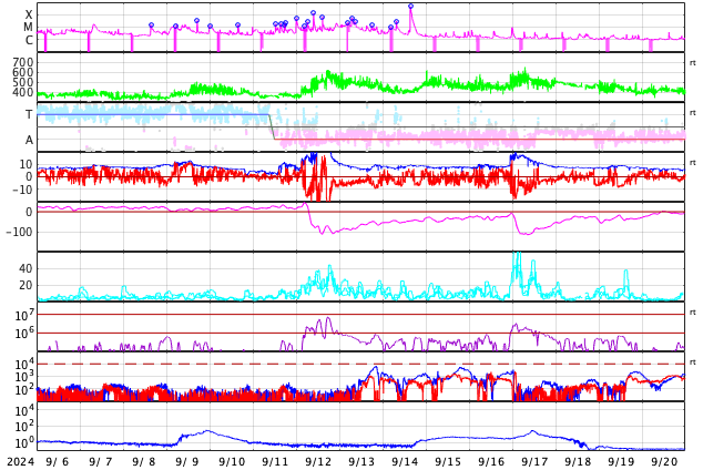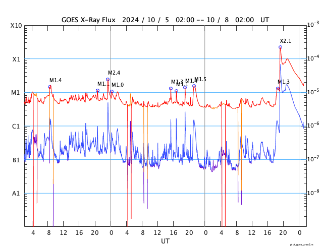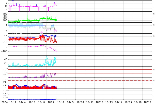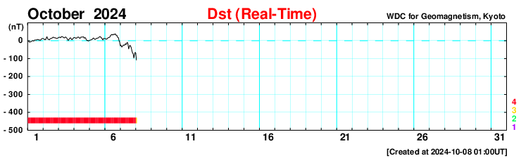(c) SDO衛星AIA131 (NASA)、(動画加工 : 宇宙天気ニュース) ![]() 太陽の右下へ飛び出すCME。 (c) SOHO衛星LASCO C2 (ESA & NASA)、(動画加工 : 宇宙天気ニュース) ![]() X2.1フレアによるCMEと紫金山・アトラス彗星。 (c) SOHO衛星LASCO C3 (ESA & NASA)、(動画加工 : 宇宙天気ニュース) ![]() Dst指数は、速報値ですが、 109nTまで下がっています。 (c) 京都大学WDC ![]() SDO衛星のAIA193カメラによる太陽コロナの様子 (c) SDO (NASA) ![]() SDO衛星による太陽の可視光写真。マウスの矢印を写真に重ねると、黒点番号付きの写真に切り替わります。 (c) SDO (NASA) ![]() GOES衛星の太陽X線強度。赤・橙 = 0.1〜0.8 nm、青・紫 = 0.05〜0.4 nm (c) データ:NOAA/SWPC、作図:宇宙天気ニュース ![]() ACEが観測した太陽風の磁場(黒線は全体の強度、赤線は南北成分) 磁場の向き、プラズマの密度、速度、温度 (c) データ:NOAA/SWPC、作図:宇宙天気ニュース ![]() AE指数(速報値) 下段のAEグラフの値が高くなると、オーロラ活動が活発化しています。 (c) 京都大学WDC ![]() ![]() 27日の太陽周期に合わせた図 太陽が同じ面を地球に向けていた27日前の変化から、今後を予想することができます。 (c) 作図:宇宙天気ニュース