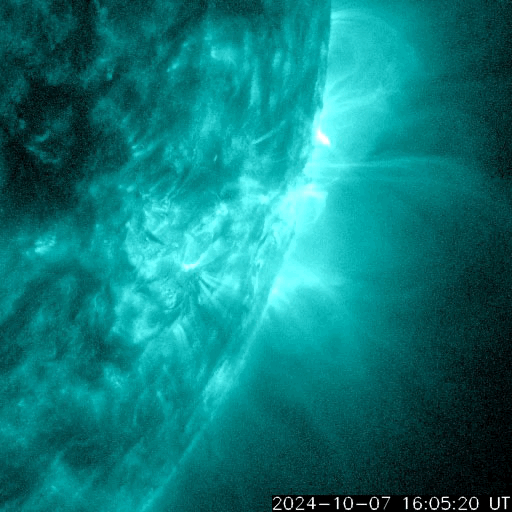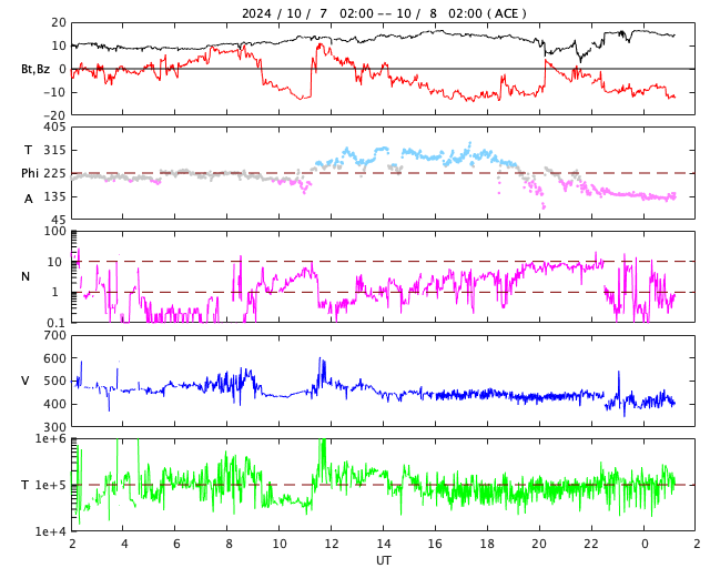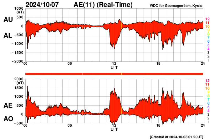 2024/10/ 8 10:27 更新 X2.1の大規模フレアが発生しました。太陽風磁場が南向きに強まって、磁気圏の活動が強まっています。 担当 篠原 今朝早く、8日4時(世界時7日19時)に、 太陽の南西の端近く(右下)の3842黒点群で、 X2.1の大規模フレアが発生しました。 3842群としては、世界時1日のX7.1、 3日のX9.0に続いて、3回目のXクラスフレアです。 SDO衛星AIA131の動画を掲載します。 X2.1の明るい輝きが発生した後、 右側の領域へ輝きが広がっています。 SOHO衛星LASCO C2、C3を見ると、 太陽の右下へ向かってCME(コロナ質量放出)が 激しく噴出しています。 地球に対して横向きに近い噴出なので、 太陽風の乱れは、やって来ても比較的小規模ではないでしょうか。 太陽風予報はどの様に発表されるでしょうか。 SOHO衛星LASCO C3では、 CMEの少し前から画面の右端に 紫金山・アトラス彗星が現れています。 この後、彗星は画面の左上へ向かって進んでいく様です。 これからどの様な尾が見られるか、注目して下さい。 太陽風は、速度は450km/秒前後と平均的な状態ですが、 磁場強度は、10〜15nTと強まった状態が続いています。 南北成分は、昨日のニュースの頃に0nT付近になっていましたが、 昨夕、7日18時(世界時7日9時)頃から、 再び南向きに強まる変化が到来していて、 -10nT前後の変化が、途中で2回ほど途切れていますが、 現在まで続いています。 このため、磁気圏の活動が激しくなり、 AE指数は、1000〜1500nTの大きい変化が 半日に渡って続いています。 また、Dst指数も -109nTまで下がっていて、 中規模の磁気嵐になっています。 (速報値なので、今後修正される可能性があります) X9.0フレアのCMEに続いて発生していた、 別のCMEの乱れが到来しているのかもしれません。 磁場強度は強まった状態が続いているので、 引き続き磁気圏活動の強まりに注目して下さい。
