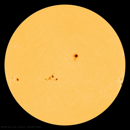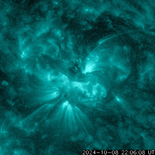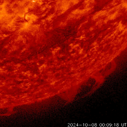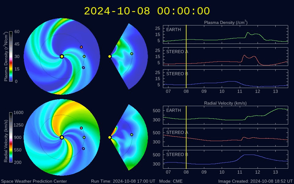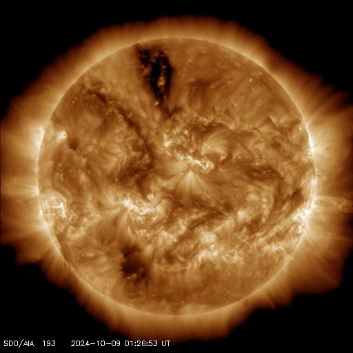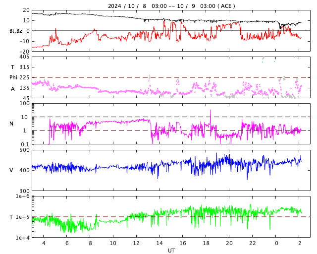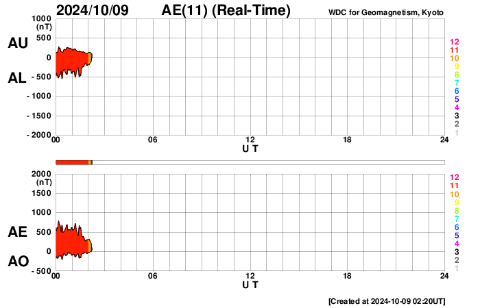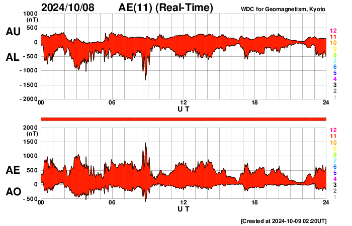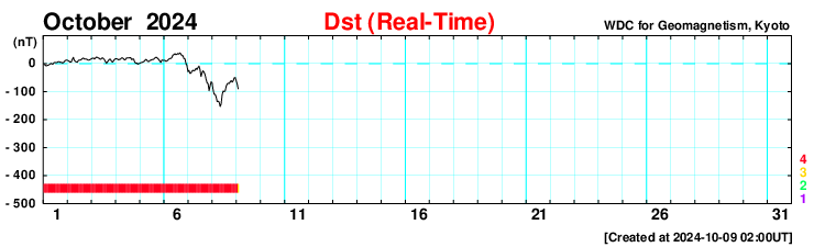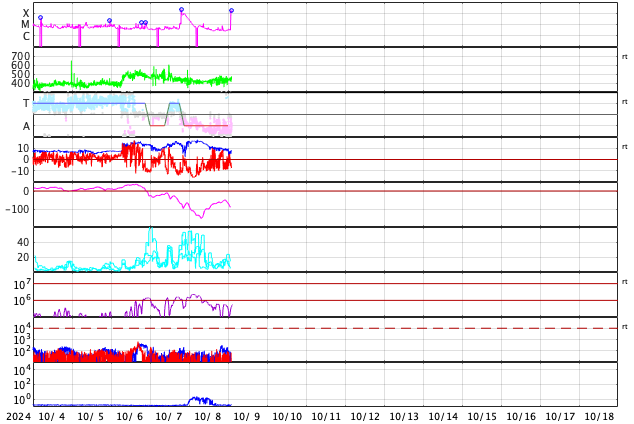 2024/10/ 9 11:27 更新 紫金山・アトラス彗星が進んでいます。X1.8の大規模フレアが発生しました。 担当 篠原 SOHO衛星LASCO C3の画像の中を、 紫金山・アトラス彗星が進んでいます。 見え始めて1日半ほど経過して、 太陽の右上あたりに達しています。 この後、さらに左上へ進んでいきます。 この動画では、 昨日朝のX2.1フレアに伴うCME(コロナ質量放出)が 太陽の右側に飛び出していますが、 これに続いて、右下にもCMEが飛び出しています。 これは、8日12時(世界時8日3時)頃に、 太陽の南西側(右下)で発生したフィラメント噴出によるものです。 SDO衛星AIA304の動画を掲載します。 NOAA/SWPCの太陽風予報では、 このフィラメント噴出のCMEによる太陽風の乱れに注目していて、 明後日の夕方、11日17時(世界時11日8時)頃に 地球に達する可能性があるとのことです。 速度の変化は小さいですが、磁場の強まりがやって来て、 南向きに大きく変化すると磁気圏の活動は強まります。 到来に注目して下さい。 太陽風は、磁場の南寄りの傾向が続いています。 速度は420〜450km/秒と平均的な状態でしたが、 磁場強度は、グラフの初めは16nT、 中程から後半にかけて10nTと強まった状態が続きました。 最後で少し下がって、現在は7nTです。 磁場の南北成分は、 -10nTを超える強い南向きはグラフの前半だけですが、 その後も、-5nT前後の南寄りの状態が続いています。 磁気圏の活動は強まった状態が続き、 AE指数は、前半は800nT前後、 後半は少し下がって500nT前後の活動が続いています。 Dst指数は、昨日の夕方に -153nTまで下がりました。 その後は変化が小さくなり、 -100nTを割るくらいで推移しています。 太陽風の変化は、この辺りで落ち着くことになりそうです。 太陽では、ちょうど記事を書いている 9日10時半(世界時9日1時半)に、 中心部北側の3848黒点群で、X1.8の大規模フレアが発生しました。 SDO衛星AIA131の動画を掲載します。 3848群は、目立つ程の活動を起こしていなかったのですが、 いきなりXフレアの発生となりました。 まだ発生直後のため、詳しい状況は分かりません。 CMEが発生していると、中心に近いため地球直撃になりそうです。 この後の情報に注目して下さい。