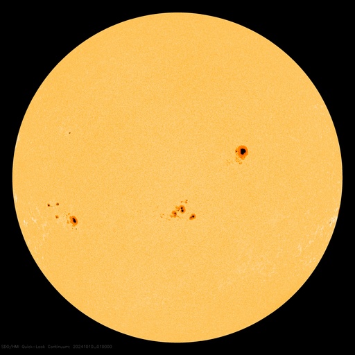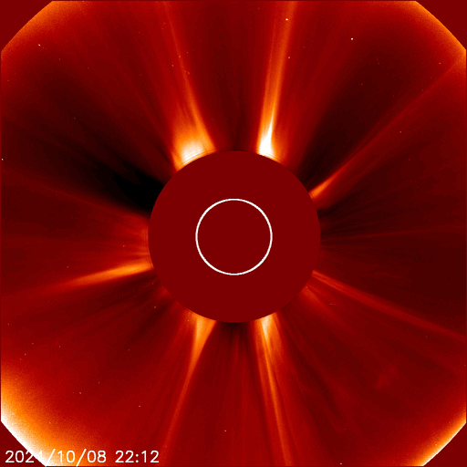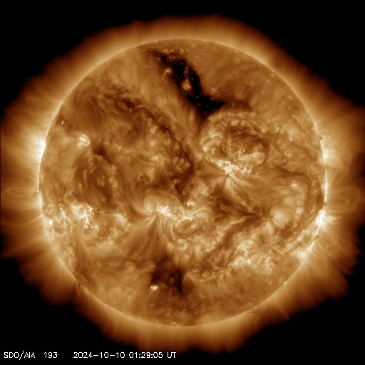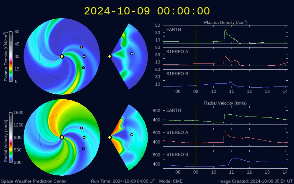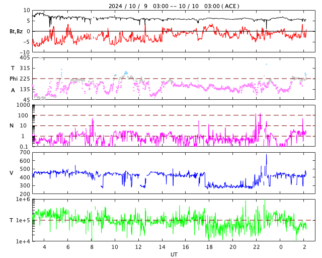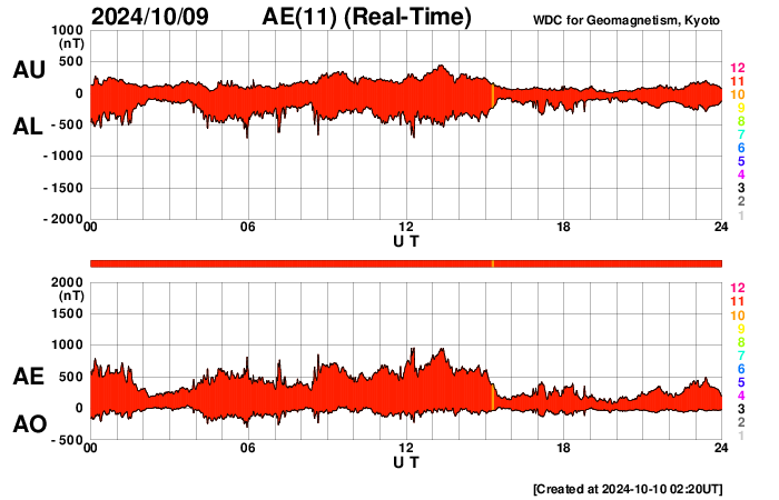 2024/10/10 11:30 更新 X1.8大規模フレアのCMEによる太陽風の乱れは地球に向かっています。 担当 篠原 昨日のニュース作成の頃、 9日10時半(世界時9日1時半)に発生したX1.8の大規模フレアについて、 詳しくお知らせします。 フレアは太陽の中心部北側の3848黒点群で発生しました。 SDO衛星AIA131による、 昨日よりもより長い時間の動画を掲載します。 フレアの輝きは長い時間続いています。 また、SDO衛星AIA193を見ると、 広い範囲でコロナのガスが激しく変化している様子が分かります。 このフレアに伴ってCME(コロナ質量放出)が発生しています。 SOHO衛星LASCO C2、C3の動画では、 太陽を丸く囲むようにコロナのガスが広がっています。 画像の時間間隔との関係もありますが、 ガスの広がる速度も速そうに見えます。 NOAA/SWPCの太陽風予報によると、 このCMEによる太陽風の乱れは、 今夜遅く、10日23時(世界時10日14時)頃に 地球に到来する可能性があります。 この場合、フレアの発生から1日半で地球までやって来ることになり、 太陽風の速度はだいぶ高まることになりそうです。 速度の高まりとともに磁場の強まりがやって来て、 南向きに強まった場合は、磁気圏の活動が激しくなります。 どの程度の乱れになるかは、 太陽風の変化が始まらないと分かりませんが、 今後の推移に注目して下さい。 SOHO衛星LASCO C3で見えている、 紫金山・アトラス彗星の様子も紹介します。 10日9時半(世界時10日0時半)までの動画です。 彗星は太陽の上側まで進んでいて、 明日には画面から出て行きそうです。 この動画の途中から、白いノイズが目立つようになっています。 これは、X1.8大規模フレアに関係して増加している 太陽放射線(非常に高速の陽子)によるものです。 その見え方から snowstorm (吹雪)と呼ばれることがあります。 太陽では、南西の端(右下)に達した3842黒点群で、 10日0時半(世界時9日15時半)にX1.4の大規模フレア、 10日8時(世界時9日23時)にM7.7の中規模フレアが発生しています。 現在の可視光写真では、 3842群は太陽の向こう側に進んで、ほとんど見えなくなっています。 一方、X1.8フレアを起こした3848群は、 その後は特に活動は発生していません。 太陽風は、速度は450km/秒から430km/秒へ少し下がっていますが、 平均的な状態です。 磁場強度は7nTから5nTへ少し下がり、こちらも平均的な値です。 磁場の南北成分は、グラフの前半は -3nT前後の南寄りでしたが、 後半は0nT付近で変化する様になっています。 磁気圏の活動もこれに対応して、 AE指数は、グラフの途中までは 500〜1000nTの中規模の変化が続いていますが、 その後は300nT程度の小規模の変化になっています。 X1.8大規模フレアに関係して、 非常に高速の陽子(太陽放射線)の数値が GOES衛星の観測で高まっています。 10MeV以上の陽子を示す赤線は、1000に達していて、 これは6月8日の高まり以来です。 SOHO衛星LASCO C3の白いノイズの増加は、 この変化に関係しています。 ![]() 3848黒点群で発生した、X1.8の大規模フレア。 (c) SDO衛星AIA131 (NASA)、(動画加工 : 宇宙天気ニュース) ![]() 広い範囲でコロナのガスが変化している様子が分かります。 (c) SDO衛星AIA193 (NASA)、(動画加工 : 宇宙天気ニュース) ![]() CMEは、太陽を丸く囲むように広がるハロー型になっています。 (c) SOHO衛星LASCO C2、C3 (ESA & NASA)、(動画加工 : 宇宙天気ニュース) ![]() 太陽風の乱れは、10日23時(世界時10日14時)頃に地球に到来する可能性があります。 (c) NOAA/SWPC ![]() 太陽の横を通過する、紫金山・アトラス彗星。 (c) SOHO衛星LASCO C3 (ESA & NASA)、(動画加工 : 宇宙天気ニュース) ![]() SDO衛星のAIA193カメラによる太陽コロナの様子 (c) SDO (NASA) ![]() SDO衛星による太陽の可視光写真。マウスの矢印を写真に重ねると、黒点番号付きの写真に切り替わります。 (c) SDO (NASA) ![]() GOES衛星の太陽X線強度。赤・橙 = 0.1〜0.8 nm、青・紫 = 0.05〜0.4 nm (c) データ:NOAA/SWPC、作図:宇宙天気ニュース ![]() ACEが観測した太陽風の磁場(黒線は全体の強度、赤線は南北成分) 磁場の向き、プラズマの密度、速度、温度 (c) データ:NOAA/SWPC、作図:宇宙天気ニュース ![]() AE指数(速報値) 下段のAEグラフの値が高くなると、オーロラ活動が活発化しています。 (c) 京都大学WDC ![]() ![]() 27日の太陽周期に合わせた図 太陽が同じ面を地球に向けていた27日前の変化から、今後を予想することができます。 (c) 作図:宇宙天気ニュース