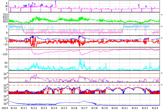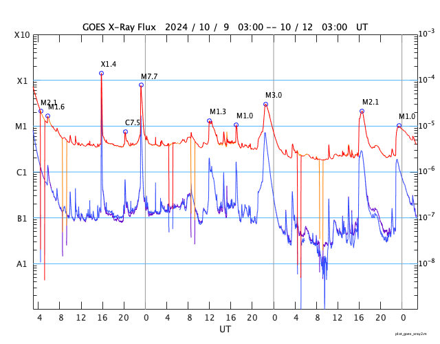 GOES衛星の太陽X線強度。赤・橙 = 0.1〜0.8 nm、青・紫 = 0.05〜0.4 nm (c) データ:NOAA/SWPC、作図:宇宙天気ニュース ![]() | ||||||||||||||||||||||||||||||||||||||||||||||||||||||||||||||||||||||||||||||||||||||||||||||||||||||||||||||||||||||||||||||||||||||||||||||||||||||||||||||||||||||||||||||||||||||||||||||||||||||||||||||||||||||||||||||||||||||||||||||||||||||||||||||||||||||||||||||||||||
